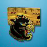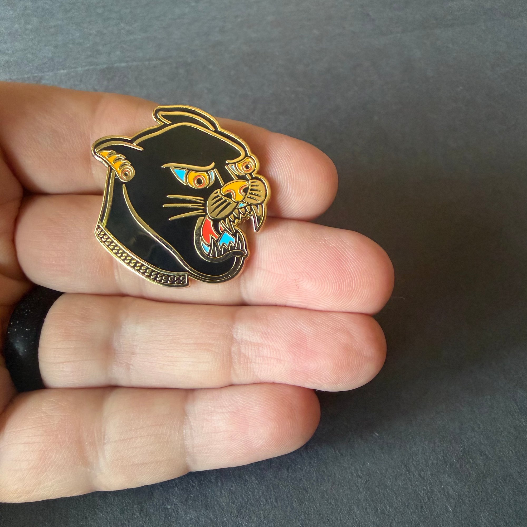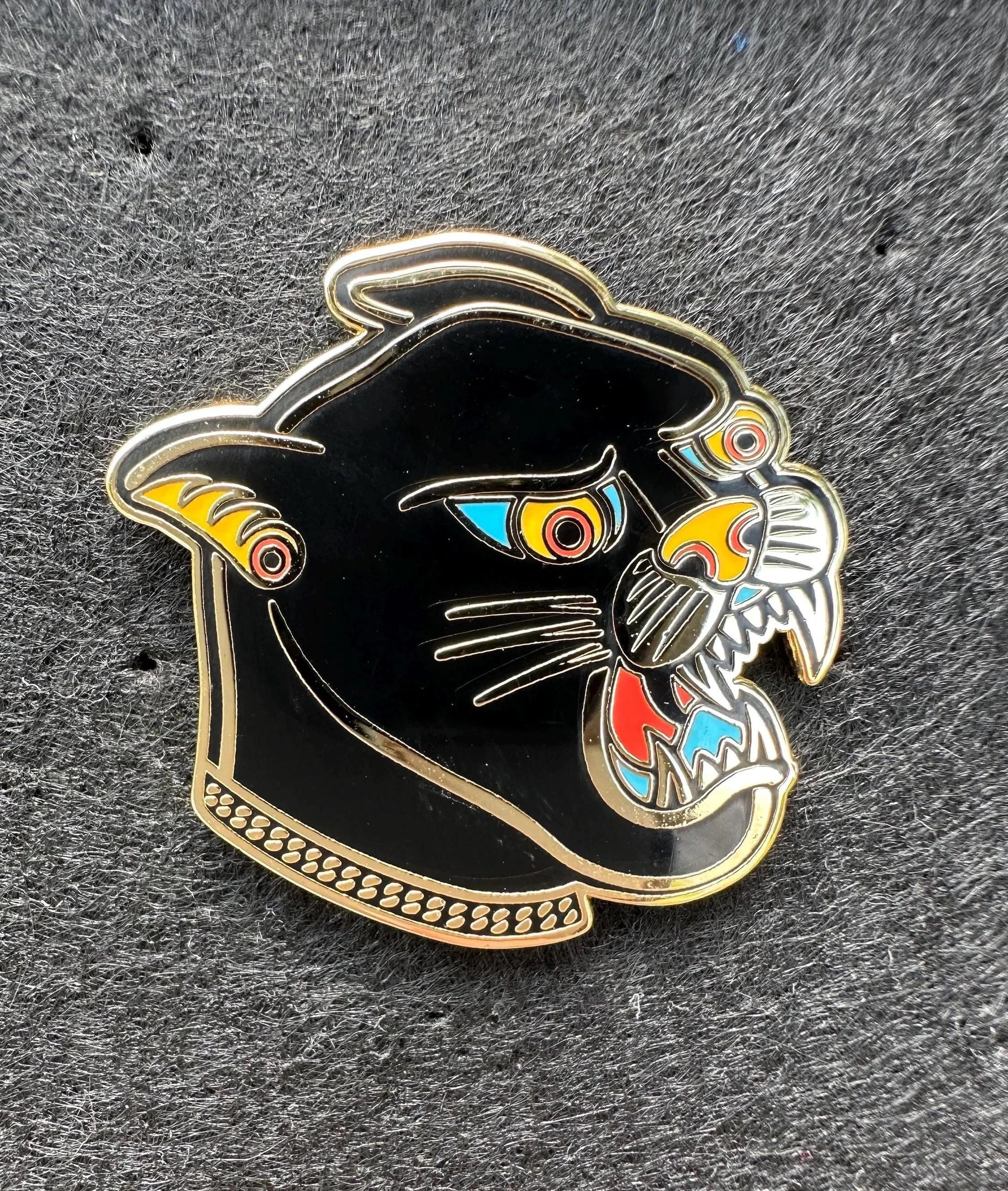 Each pin is crafted in hard enamel with polished metal and secure backings, ready to wear on jackets, bags, hats, or to display on your pin board. This sturdy black panther with a thick gold chain stands 1.38” tall.