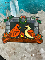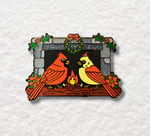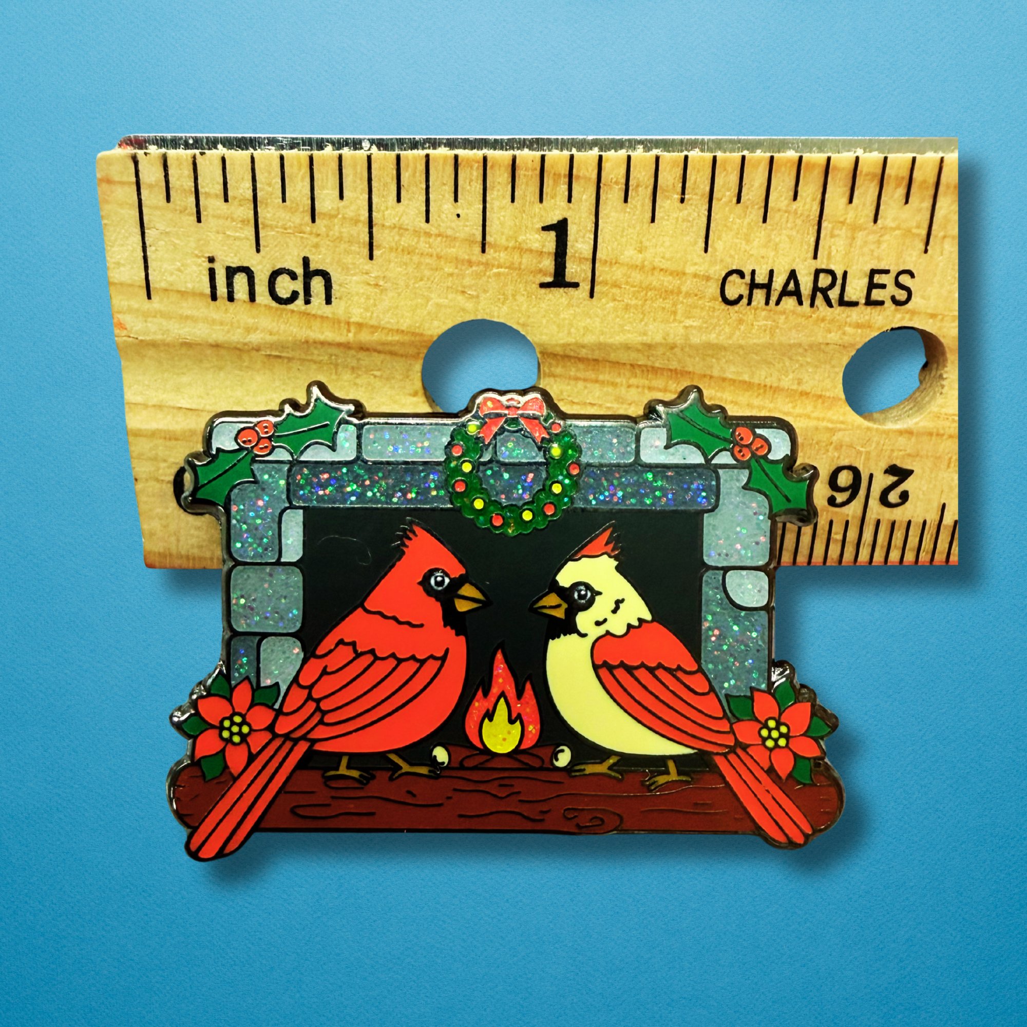 This Christmas cardinal enamel pin perches the bright red bird on a glittering fireplace wreath, a cozy holiday scene perfect for winter jackets and gift giving.