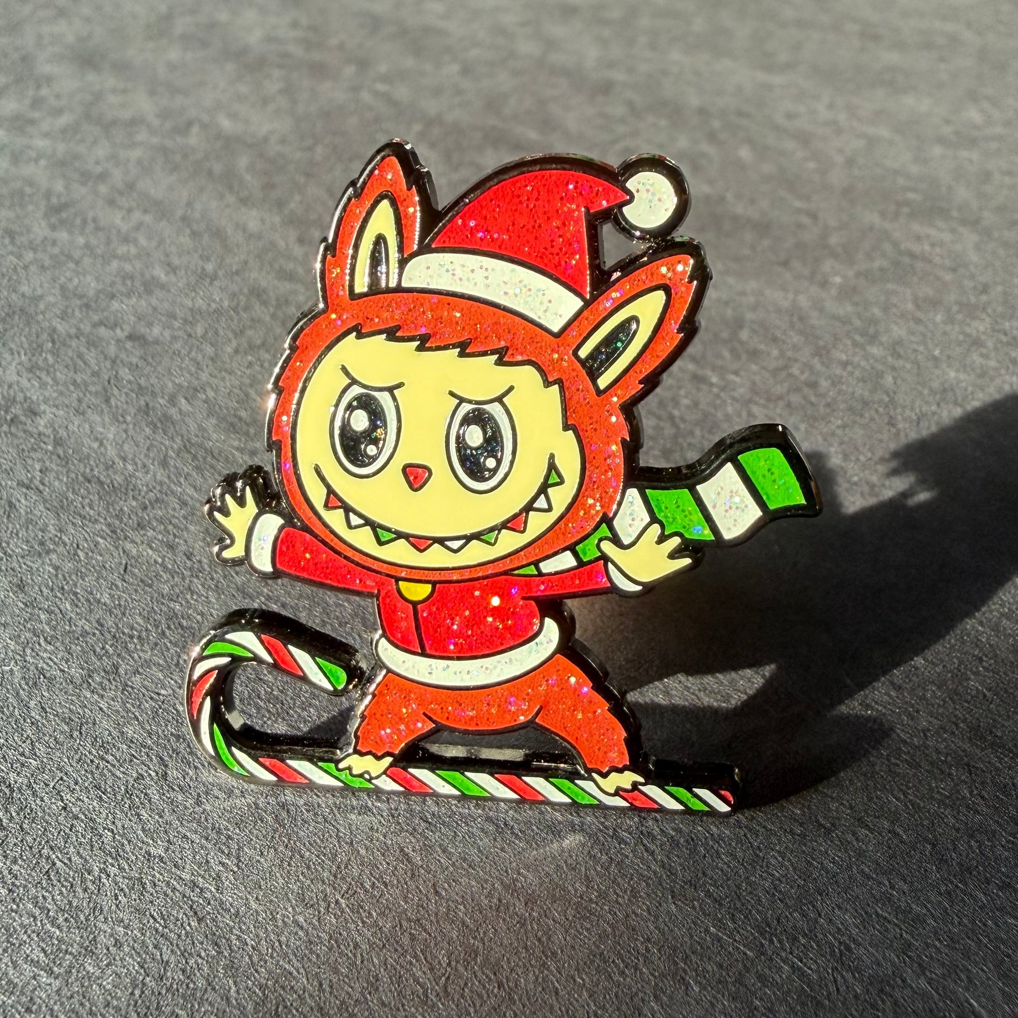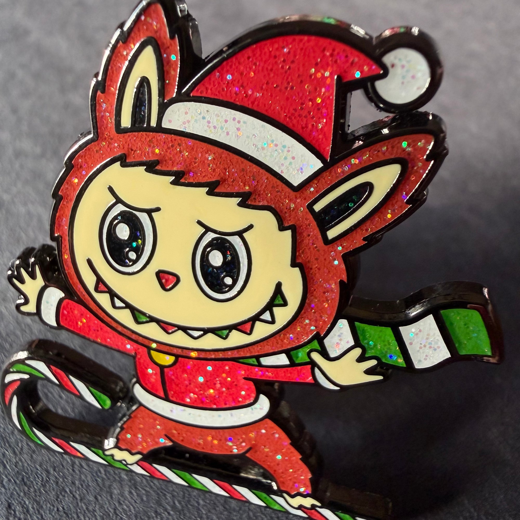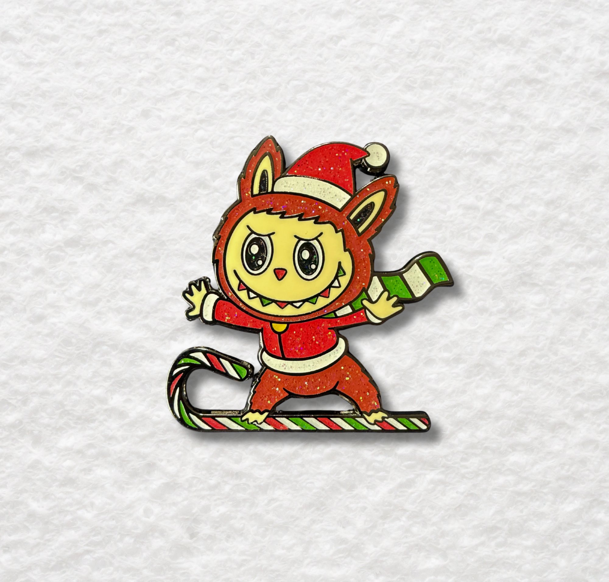 Labubu rides high atop a three color candy cane, snow skiing across the winter terrain.