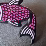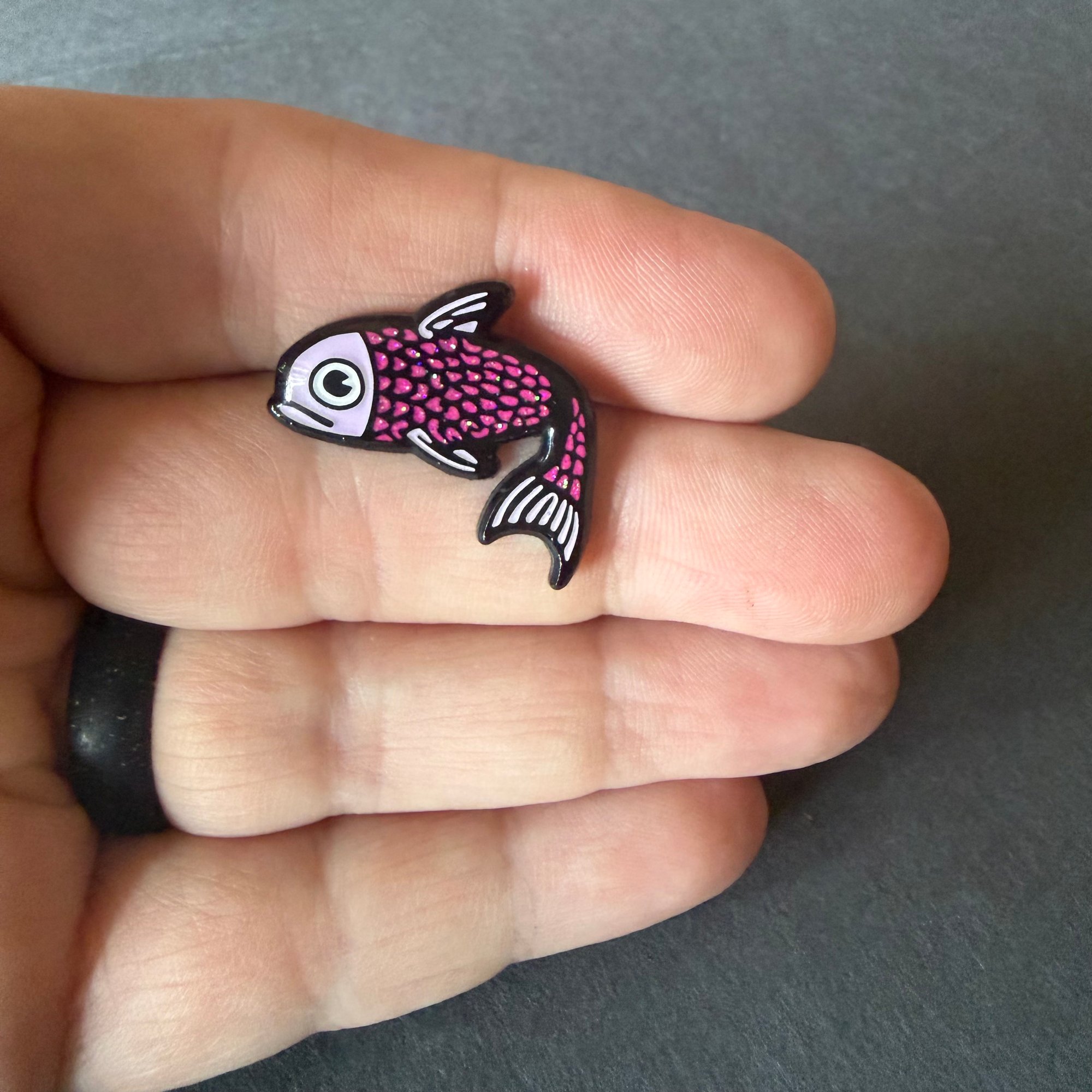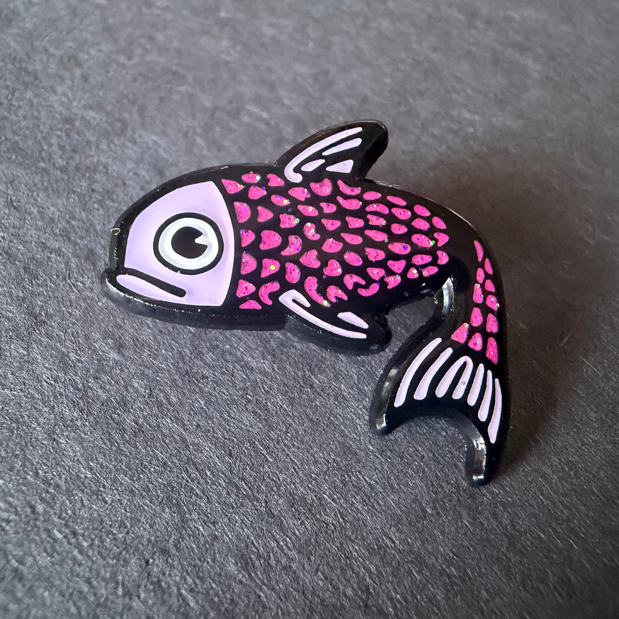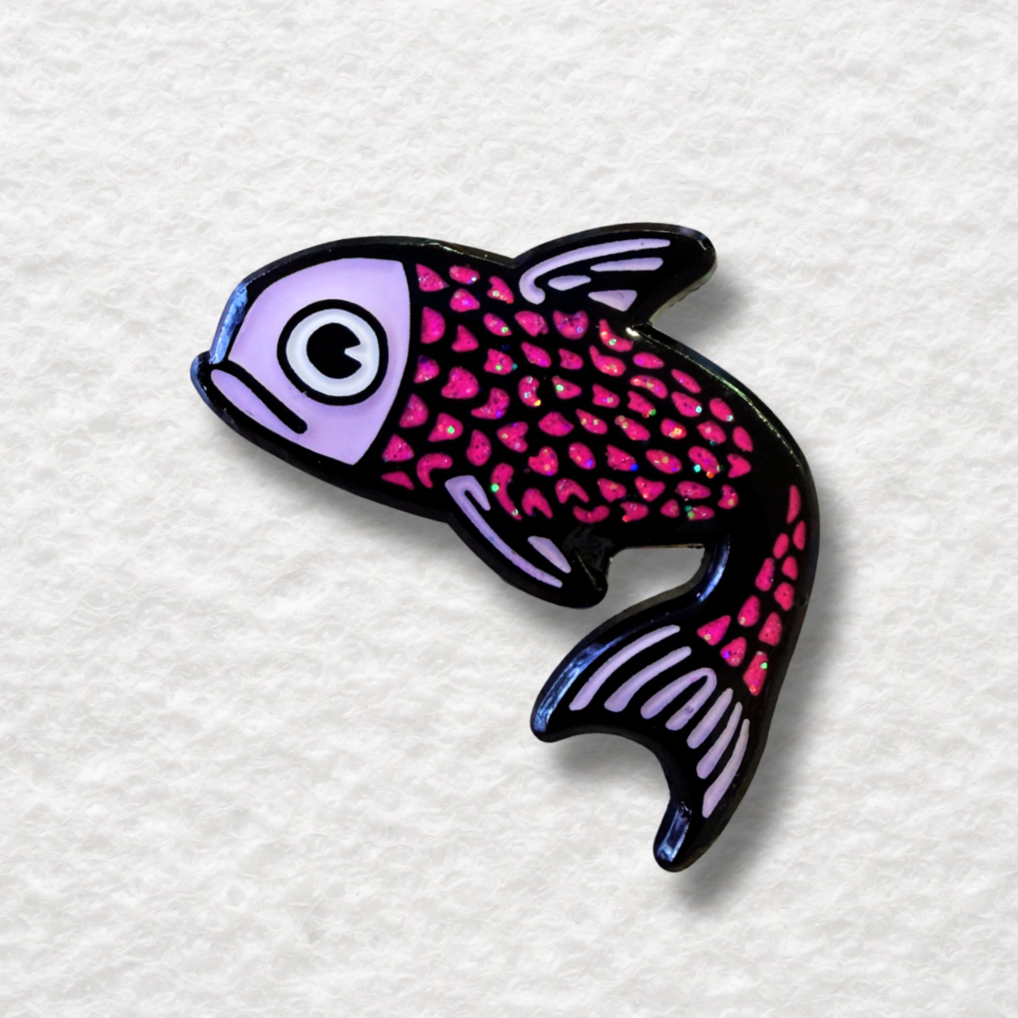 For the person who loves bold color and a little weirdness. This pink glitter fish enamel pin is a bright, eye-catching piece of wearable art, designed for jackets, backpacks, tote bags, and pin boards. The fish pins are 1" in length, small enough to be subtle on a jacket or bag.