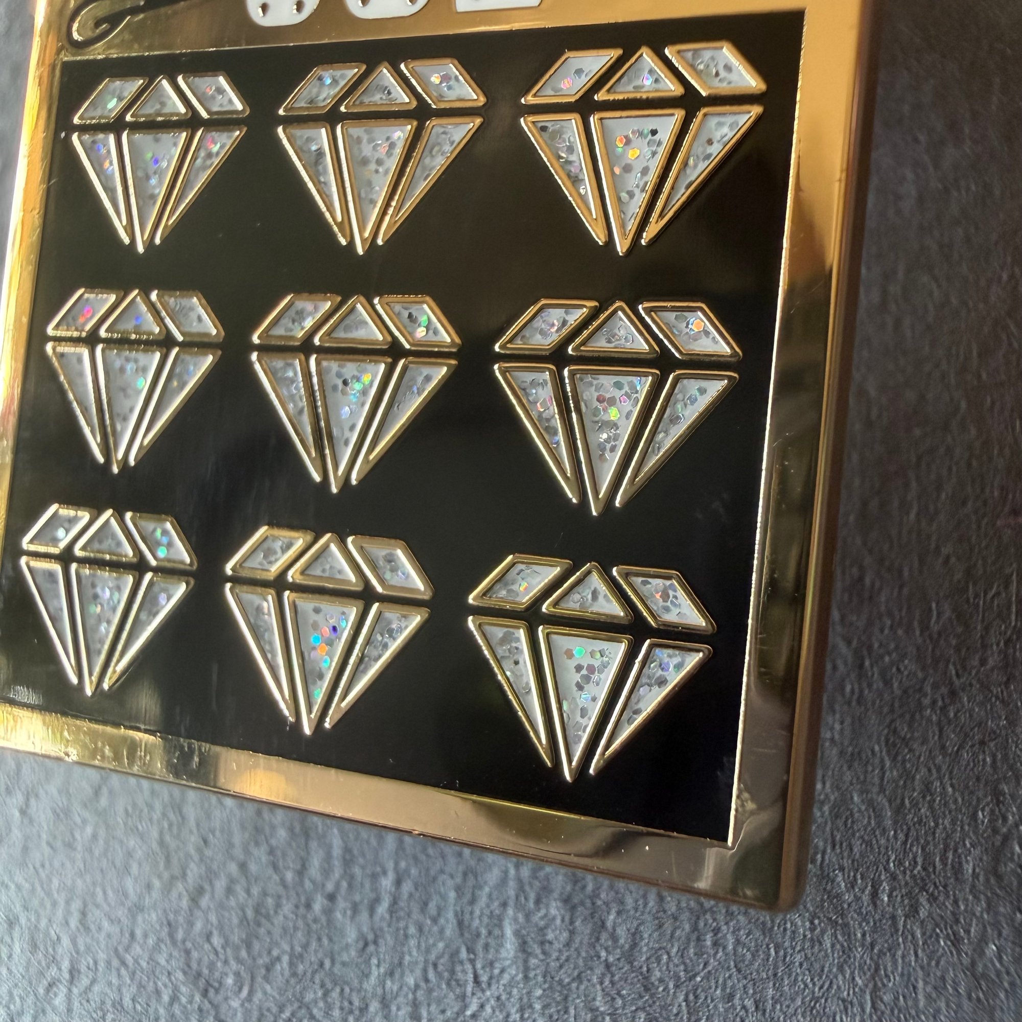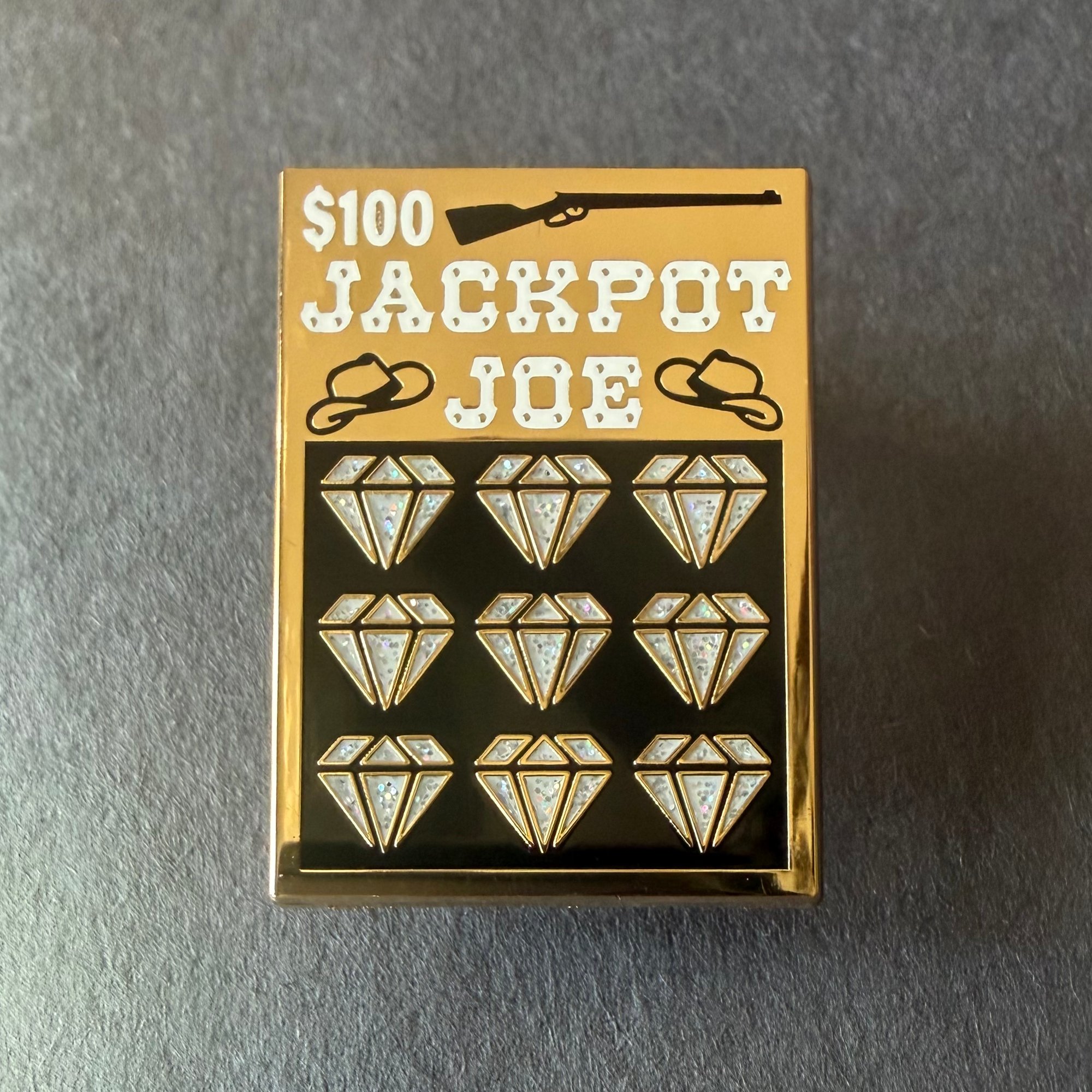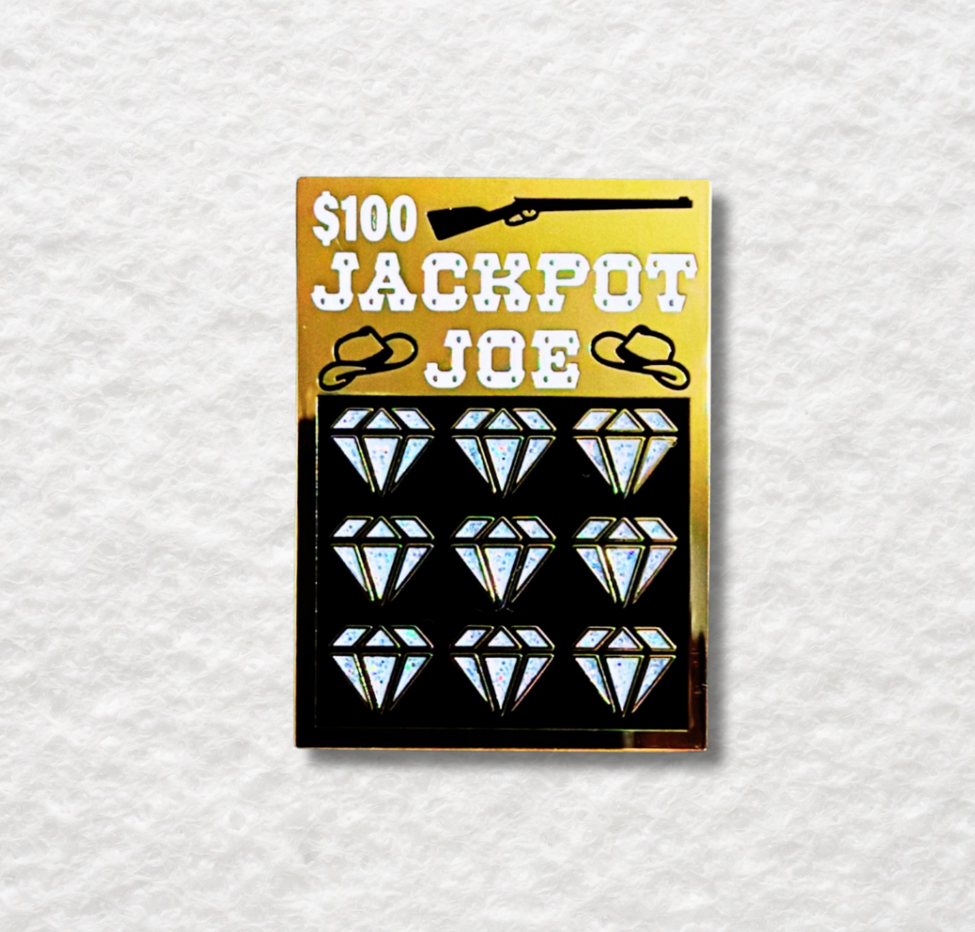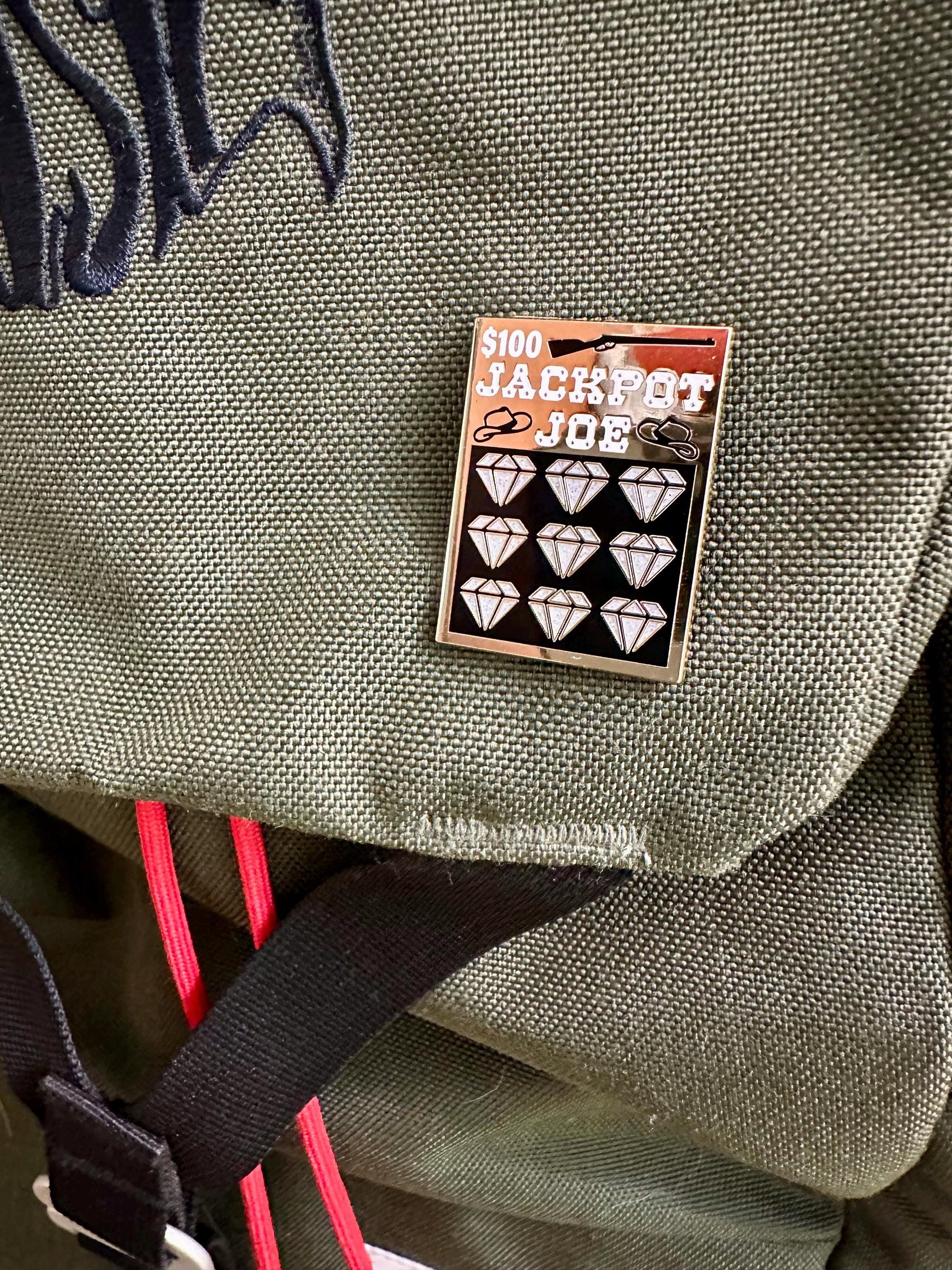 This Glitter Diamonds Jackpot Joe enamel pin looks like a scratch off ticket with sparkling diamonds, a casino art piece for gamblers, lottery fans, and enamel collectors.
