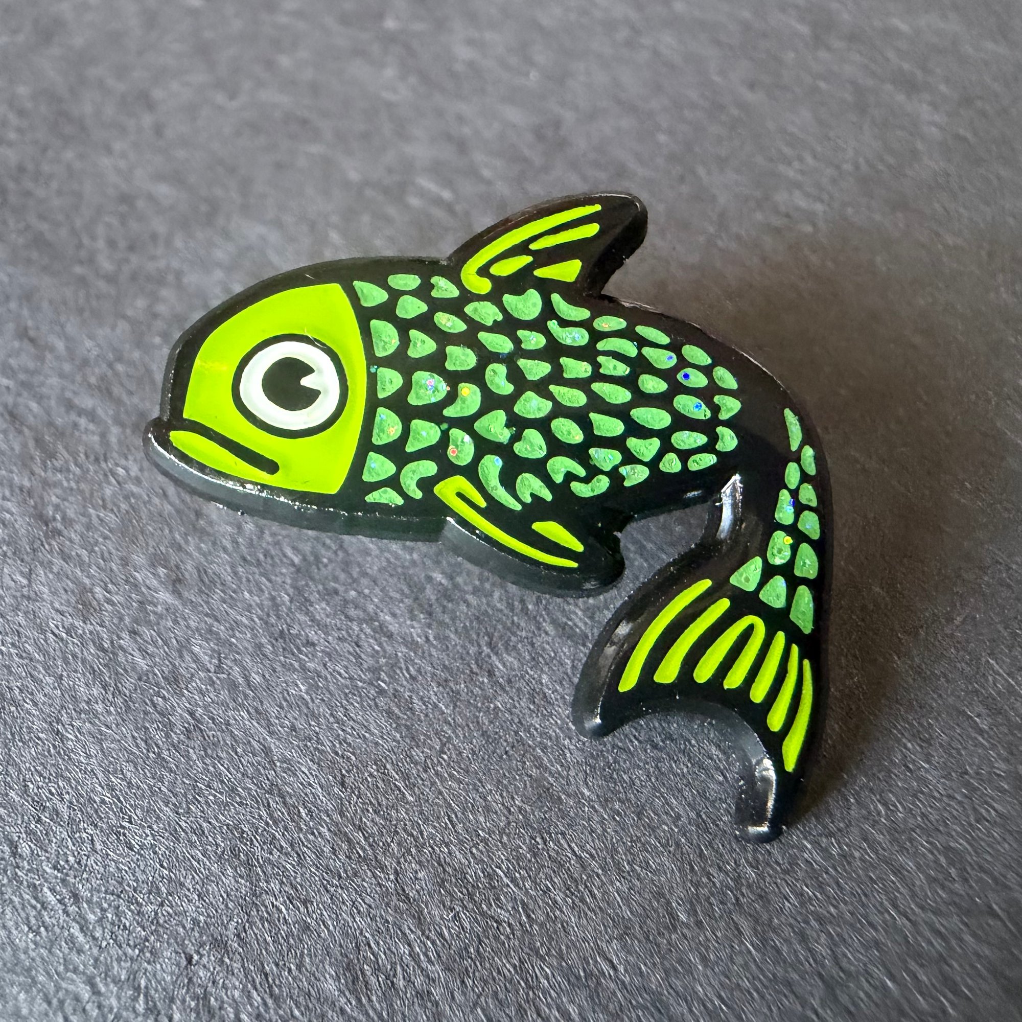For the person who loves bold color and a little weirdness. This green glitter fish enamel pin is a bright, eye-catching piece of wearable art, designed for jackets, backpacks, tote bags, and pin boards. The fish pins are 1" in length, small enough to be subtle on a jacket or bag.