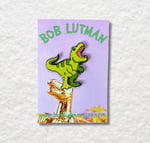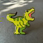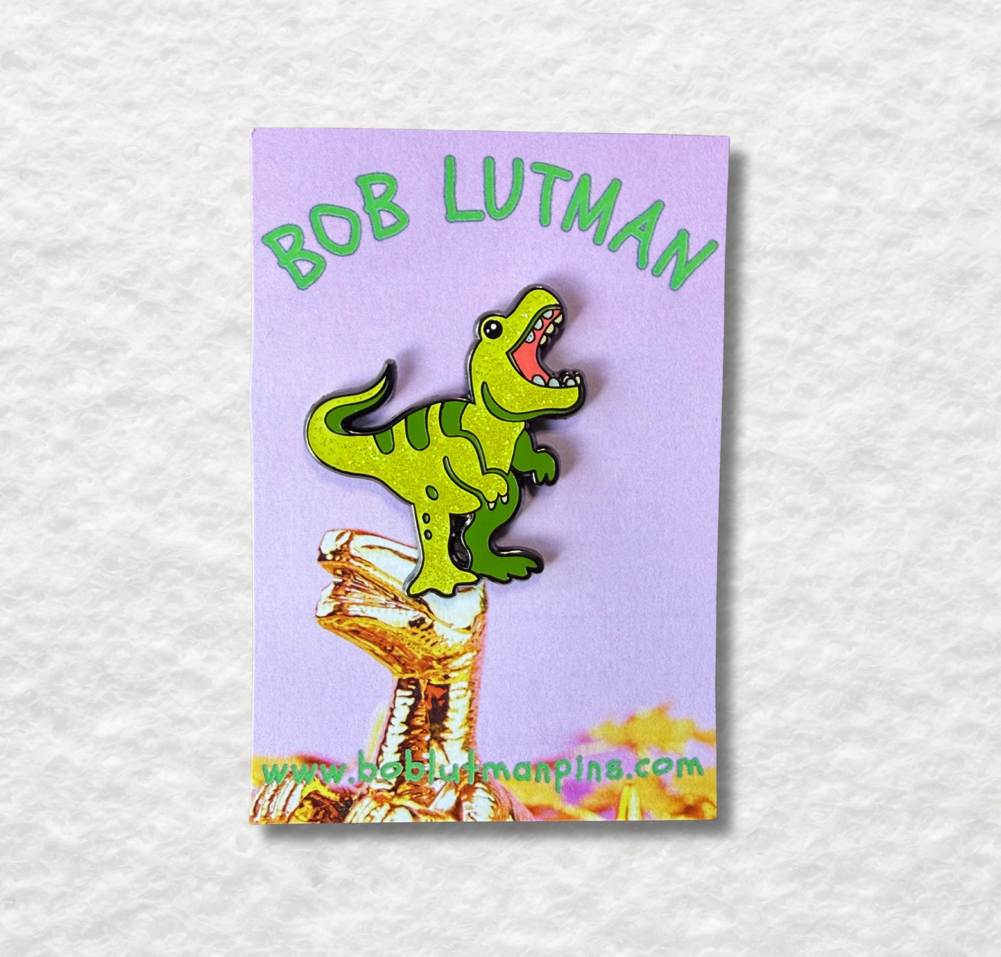 This glitter T-Rex Dino enamel pin features a green and yellow dinosaur with an icy sparkle grill, mixing prehistoric power with hip hop jewelry flair.