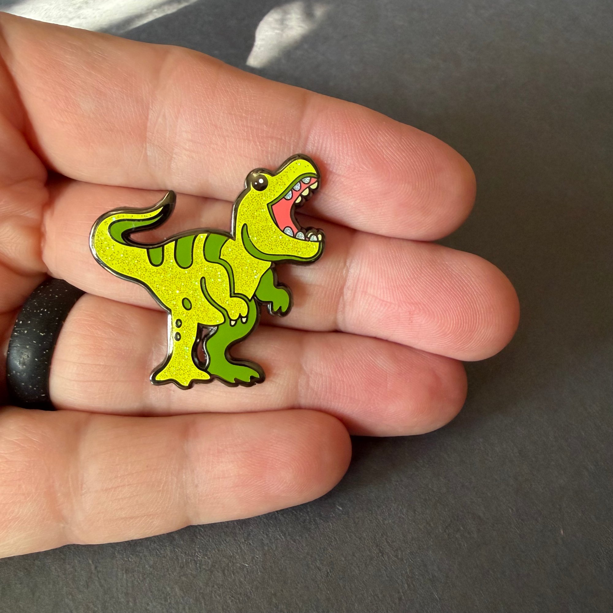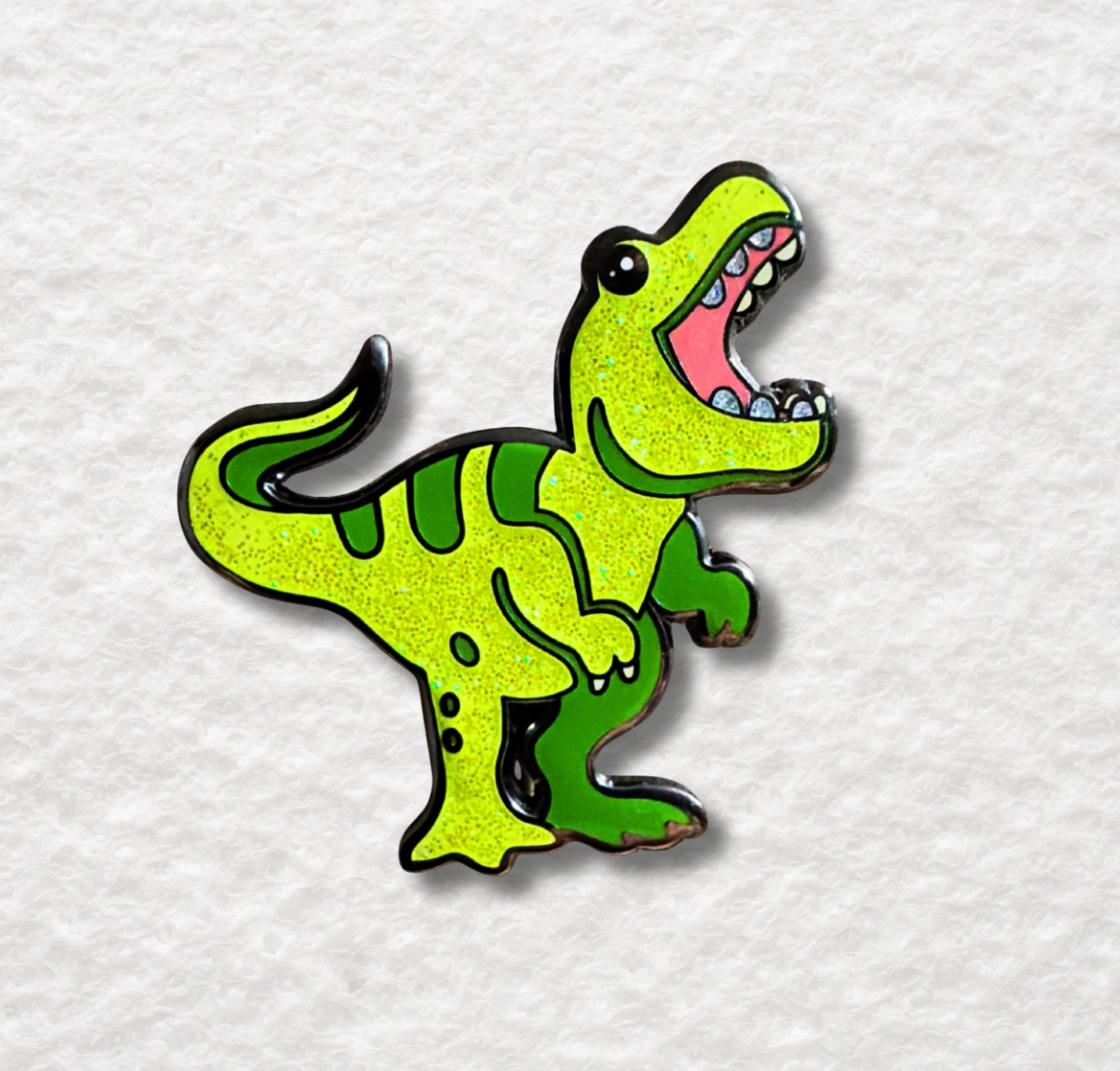 Each pin is crafted in hard enamel with polished metal and secure backings, ready to wear on jackets, bags, hats, or to display on your pin board. This sturdy Glitter Dino is 1.38" tall.