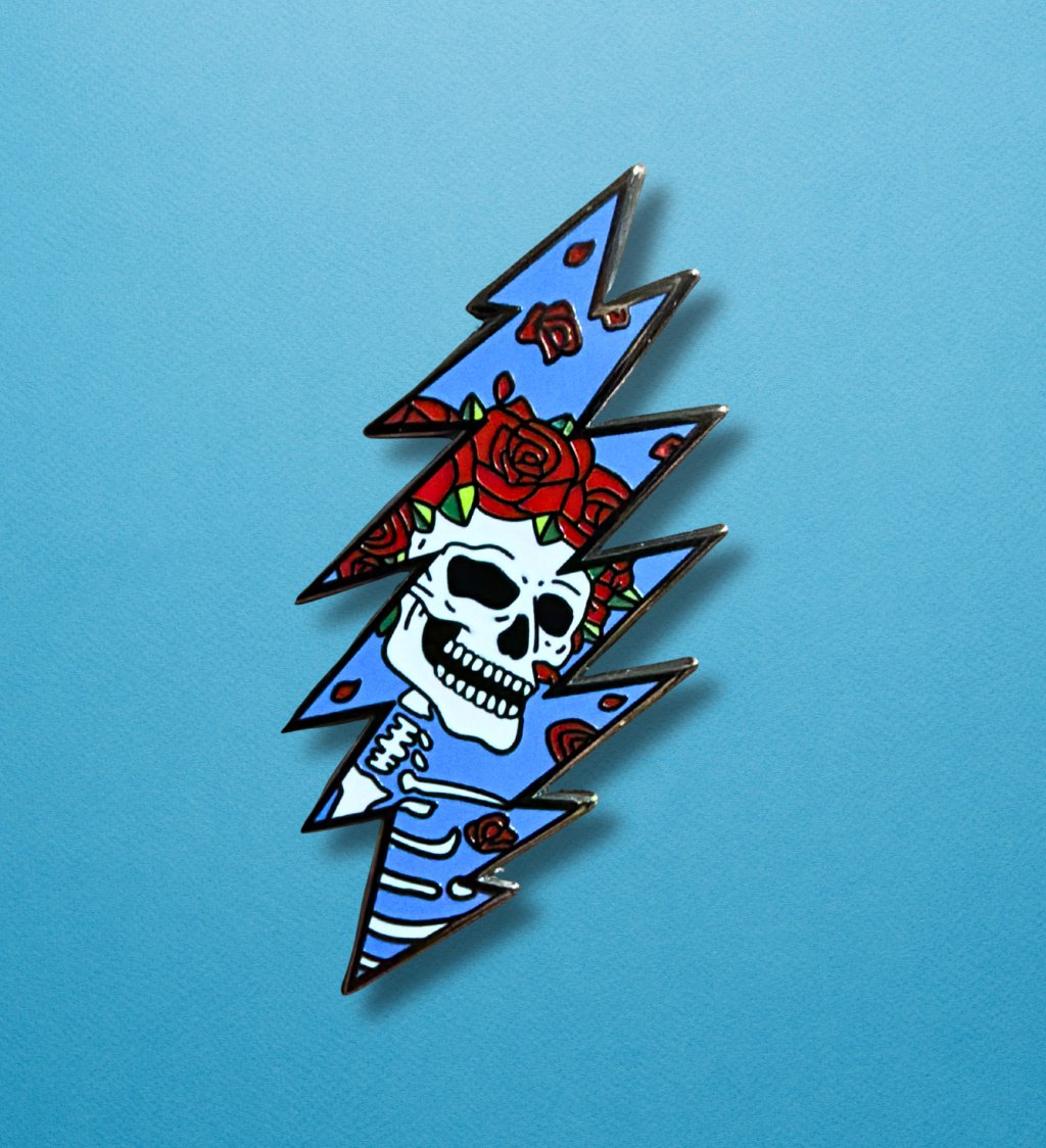 Celebrate one of the most iconic images with this detailed Bertha Skeleton enamel pin, complete with the classic 13-point lightning bolt and deep red roses. This pin is perfect for Deadheads, collectors of psychedelic art, and fans of vintage concert poster style.