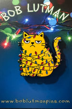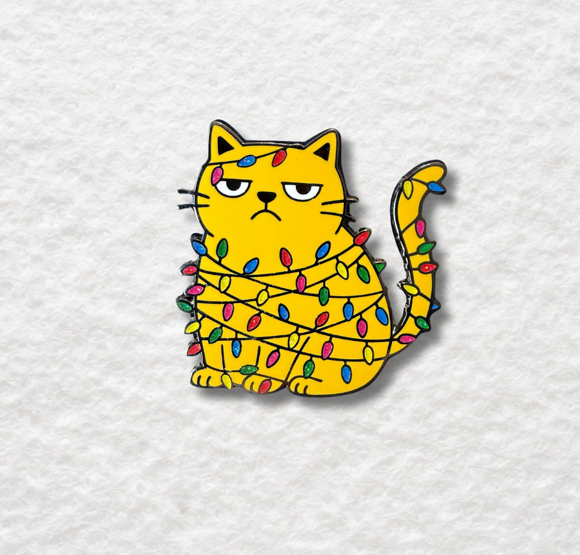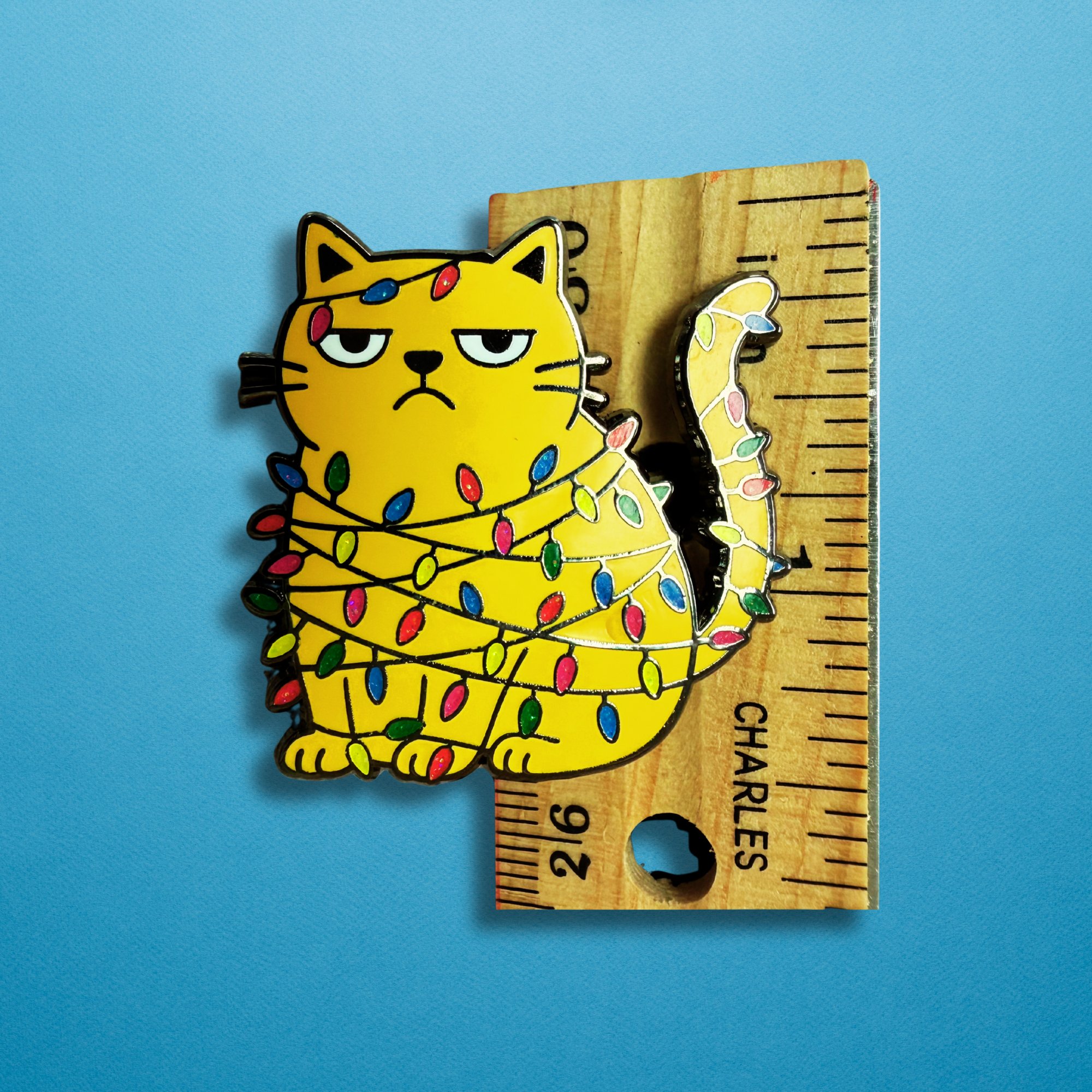 This enamel pin shows a frustrated feline tangled in glittery Christmas lights, a perfect holiday accessory for cat lovers with a sarcastic streak.