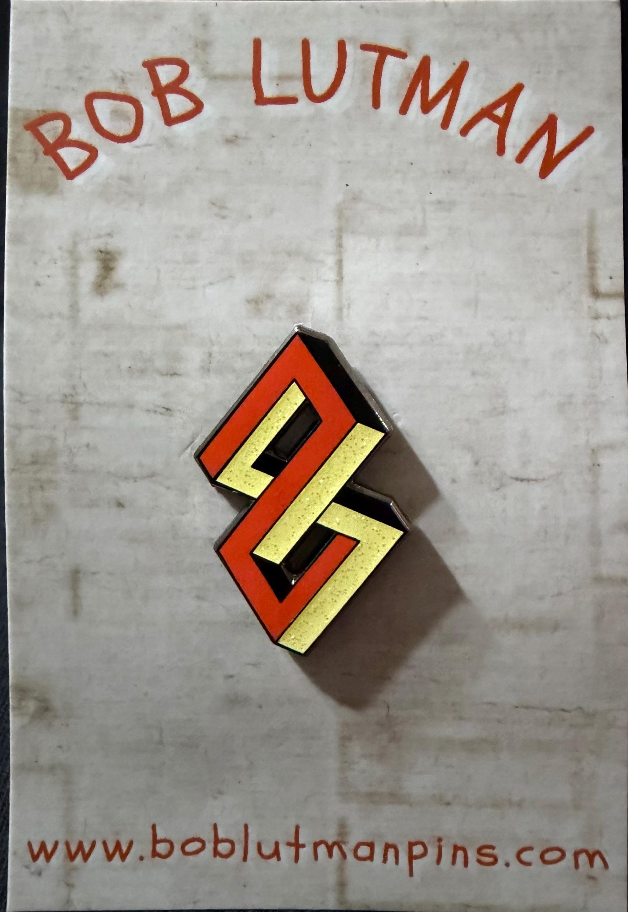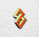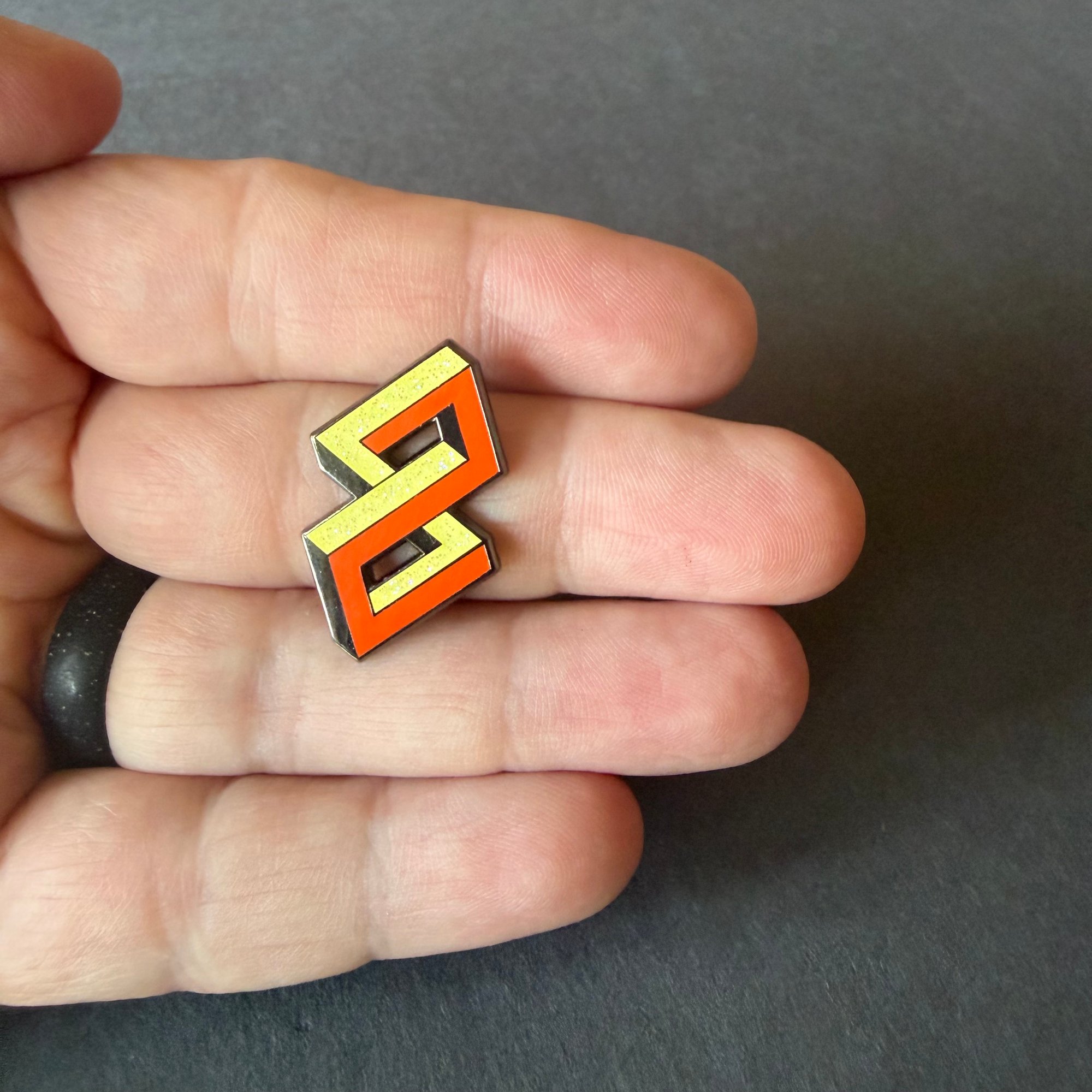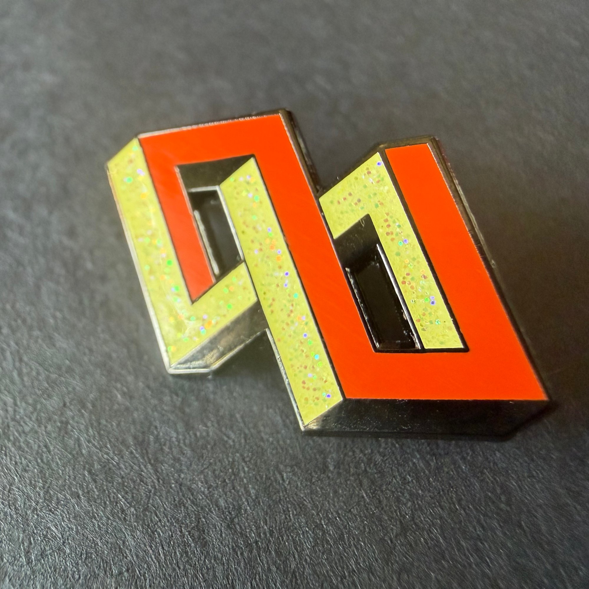 This impossible object enamel pin combines Penrose-style geometry with glitter This impossible object enamel pin combines Penrose-style geometry with glitter fills, creating a small wearable sculpture for fans of Escher and mind-bending design.