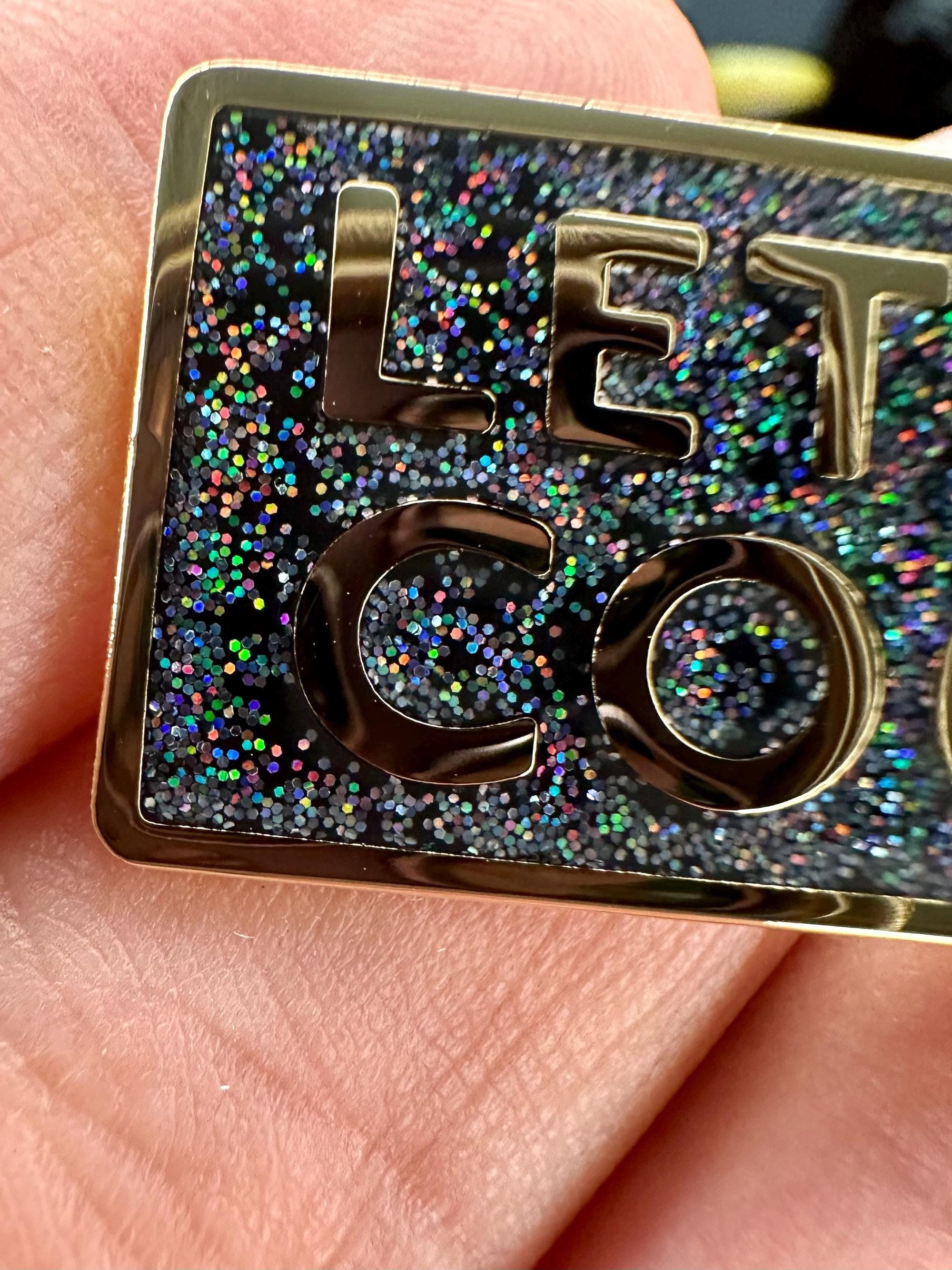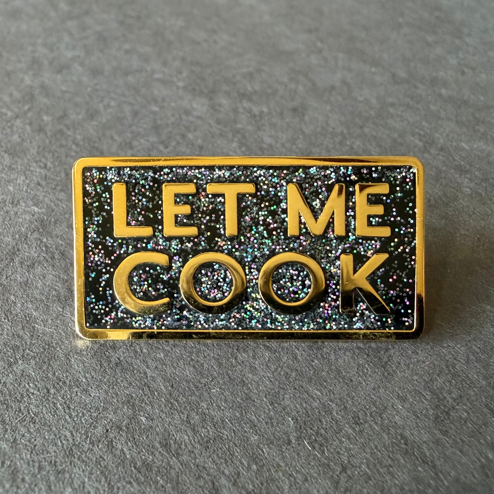 This LET ME COOK enamel pin is gold plated with rainbow glitter, a bold internet-slang badge for chefs, creatives, and anyone ready to prove themselves.