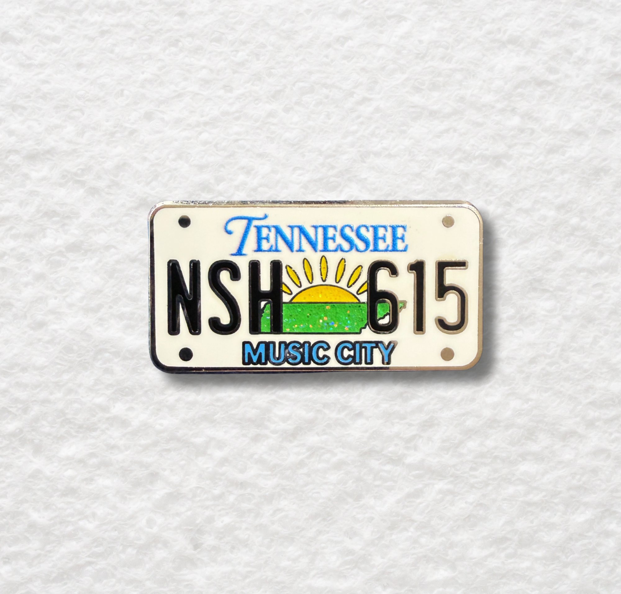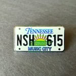Vintage Tennessee license plate from the early 2000's with glitter state and sun. MUSIC CITY proudly displayed and the whole pin is hard enamel. High quality pin construction and 1.25" for subtle display.