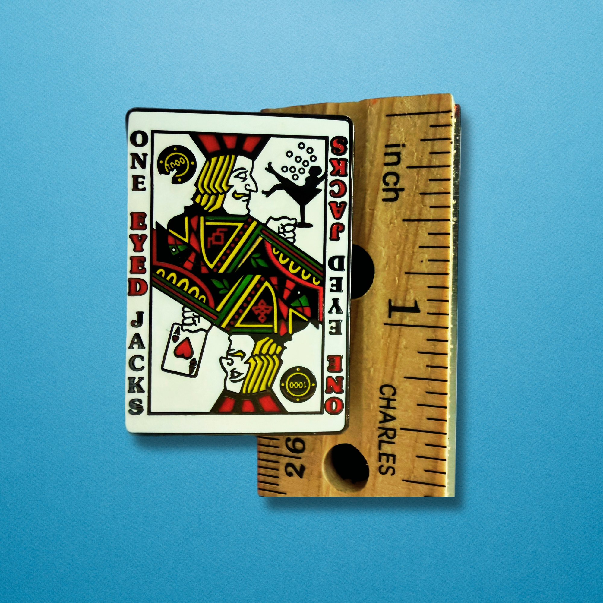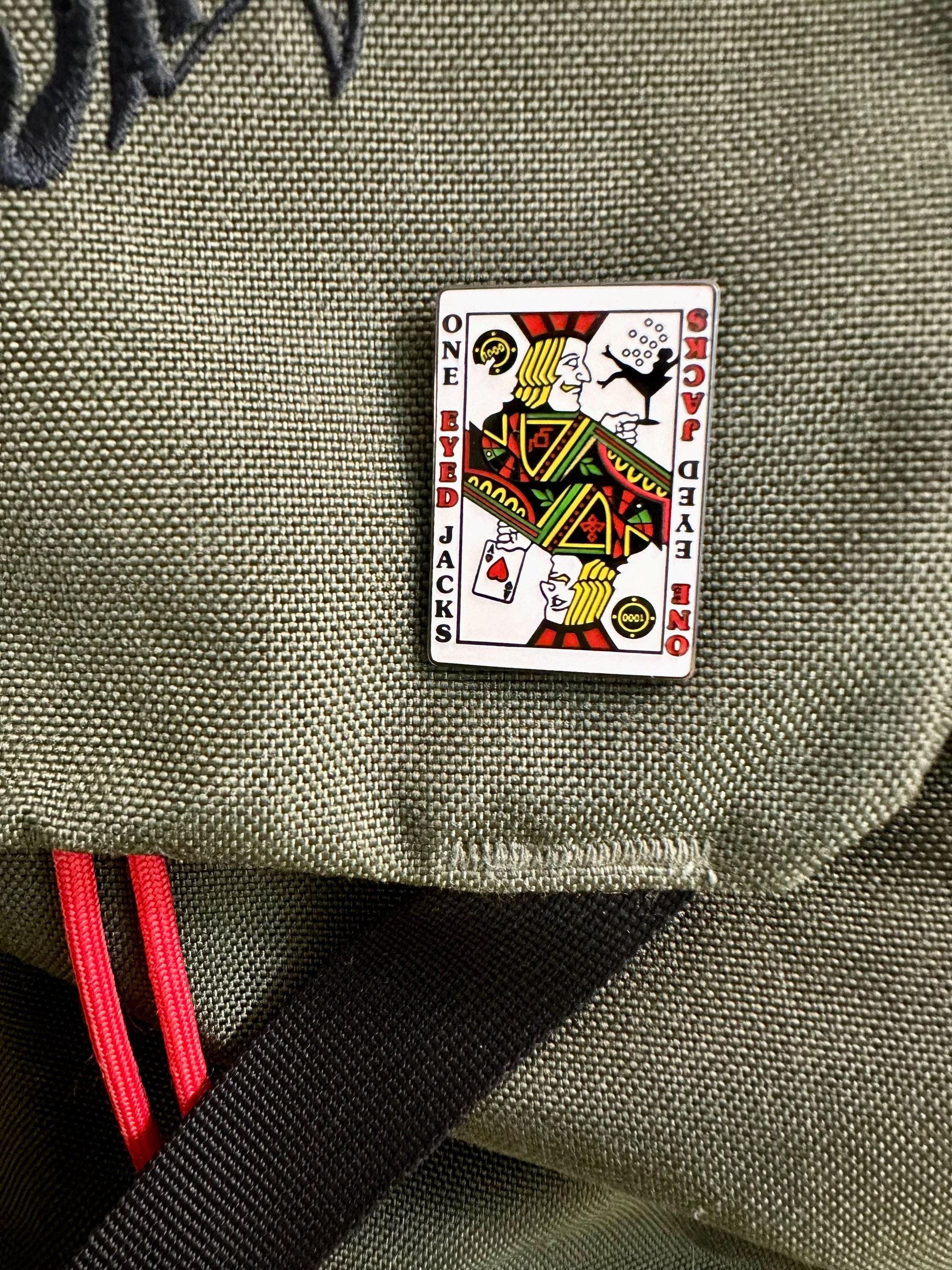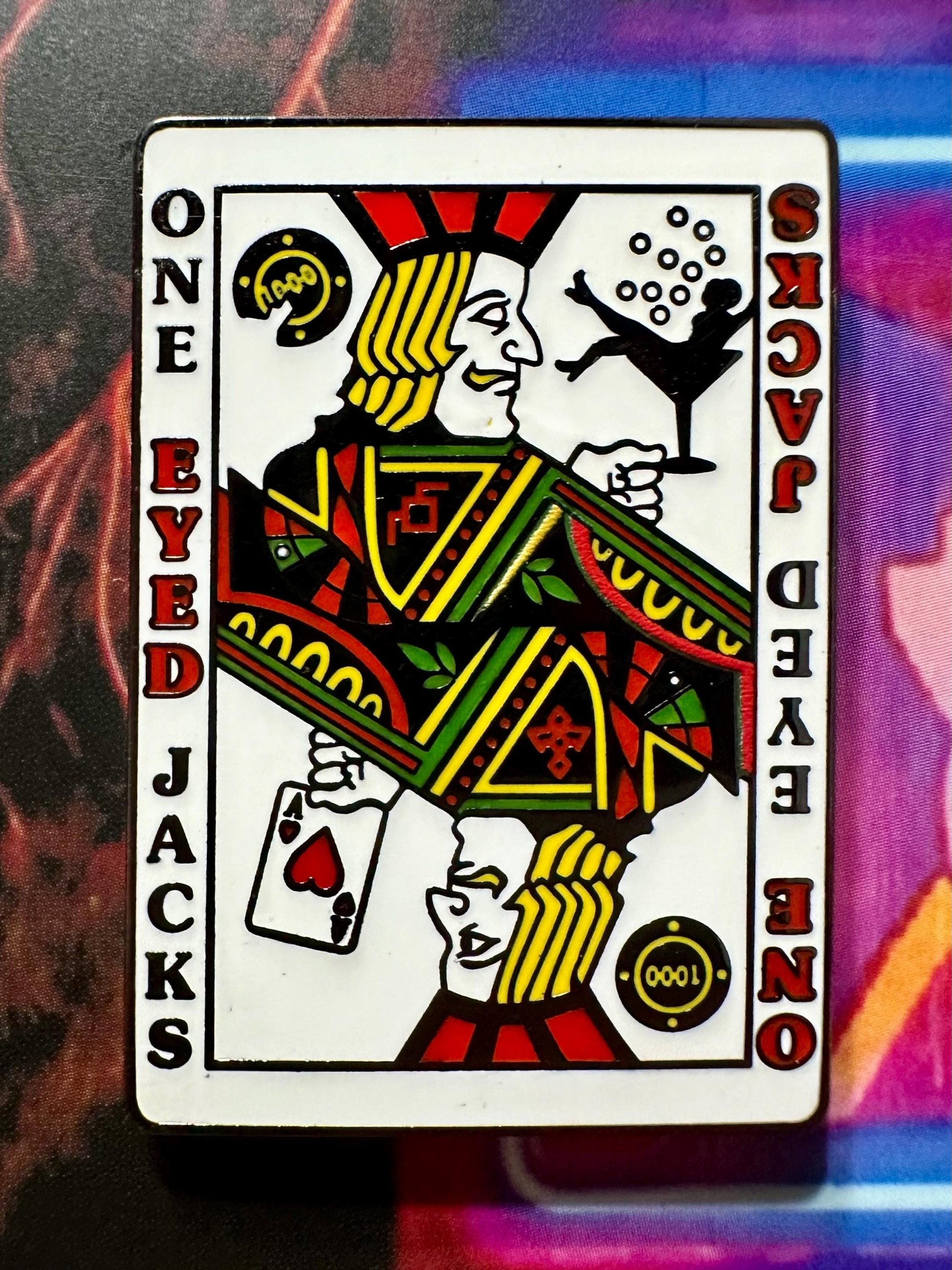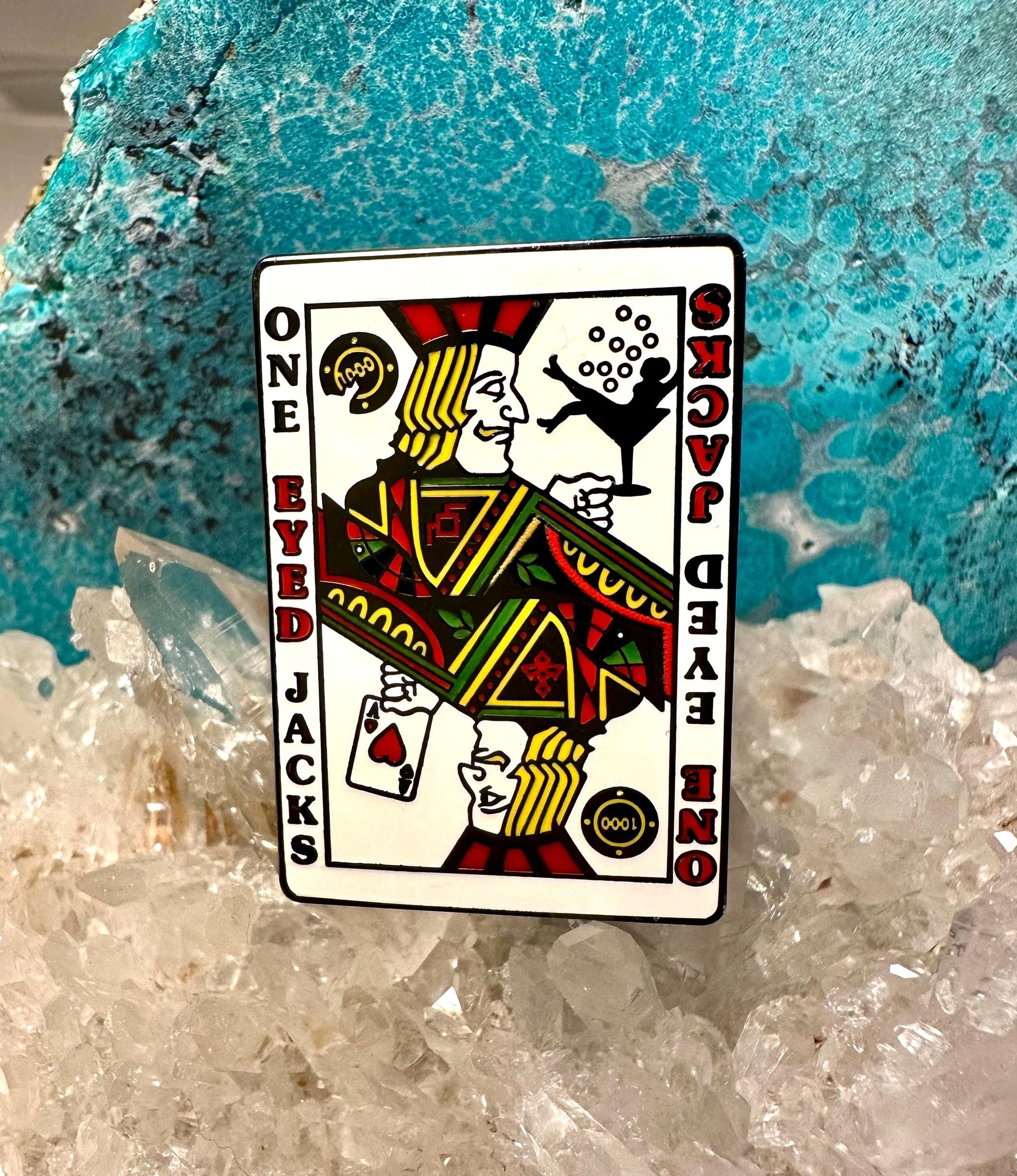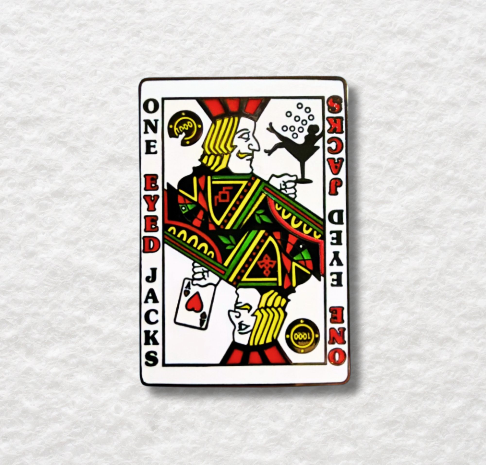Step into the world of mystery and intrigue with Bob Lutman's 'One Eyed Jacks' enamel pin inspired by the world Twin Peaks and the casino owned by the Horne brothers. This design features a portal between two worlds - what's seen and what remains hidden.