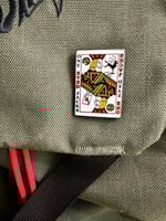 This pin is 1.5" tall on hard enamel with black nickel plating. High quality pin production and materials. Limited run #'s of 100 made printed on the back beneath my backstamp. Two pinbacks with black rubber clutches.