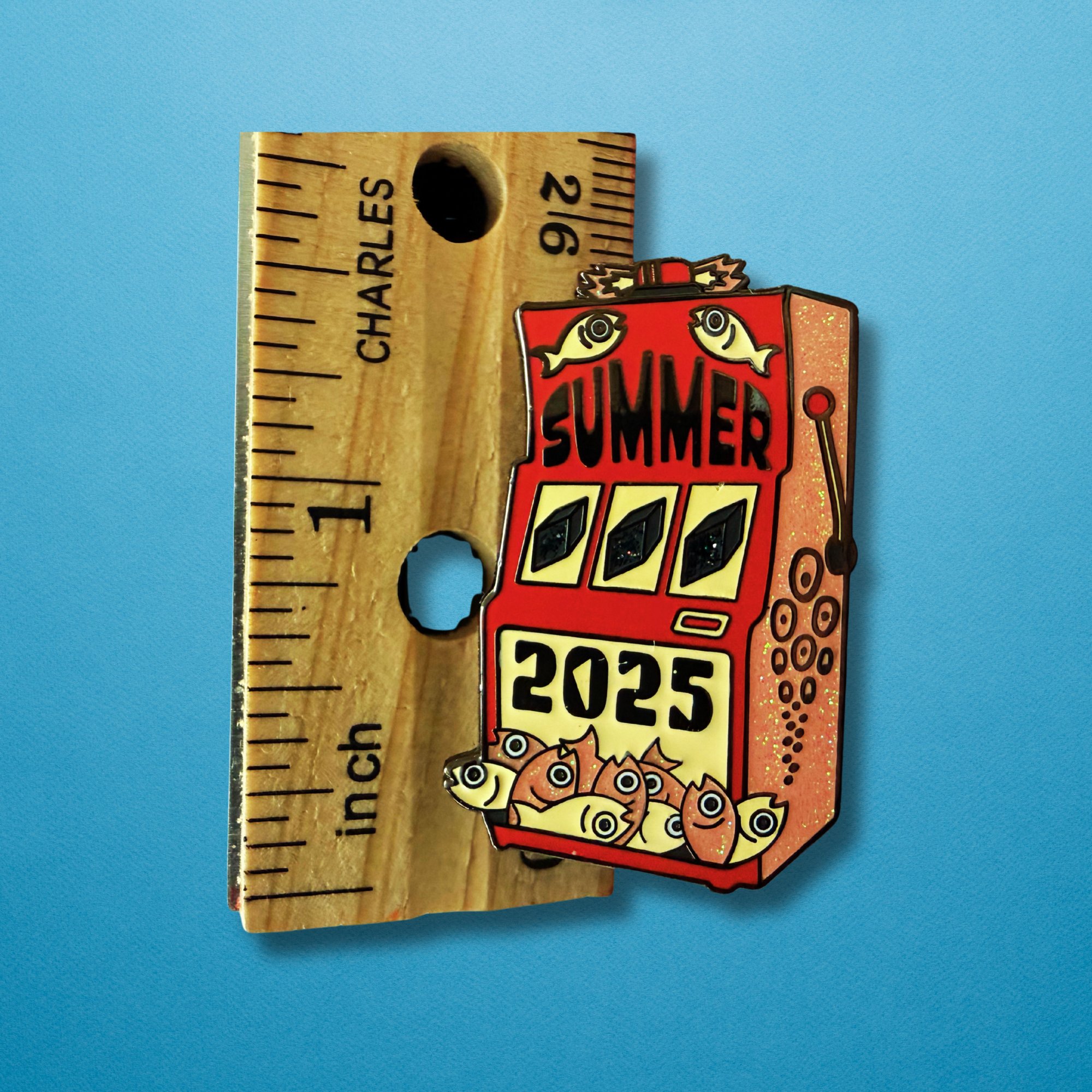 This Phish Summer 2025 tour enamel pin features a red glitter slot machine design, a lucky piece of phan art for jam band fans and casino themed collectors.