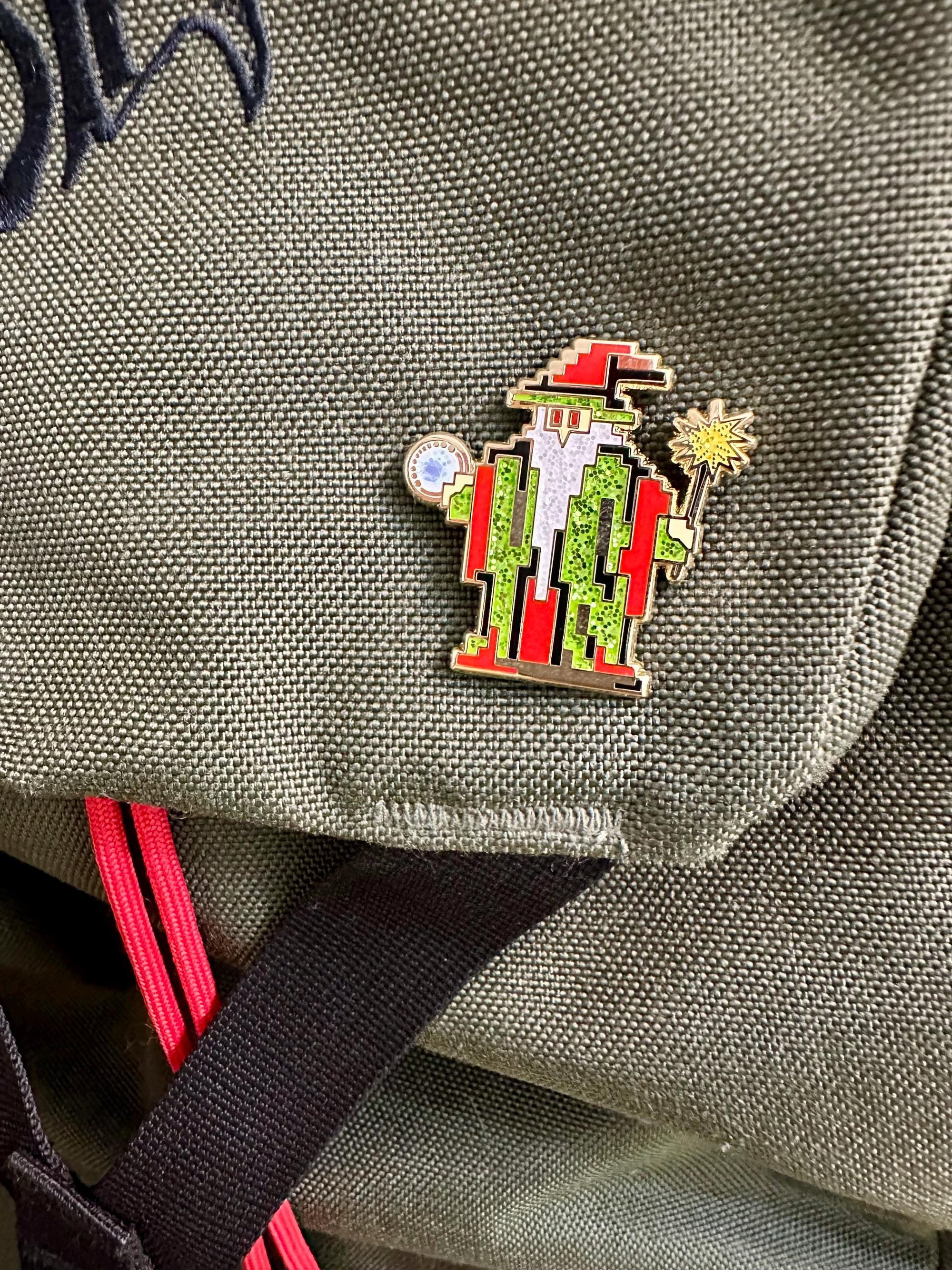 This pixel wizard enamel pin features rasta-inspired colors with glitter fills and gold plating, bringing retro game pixels and reggae vibes together.