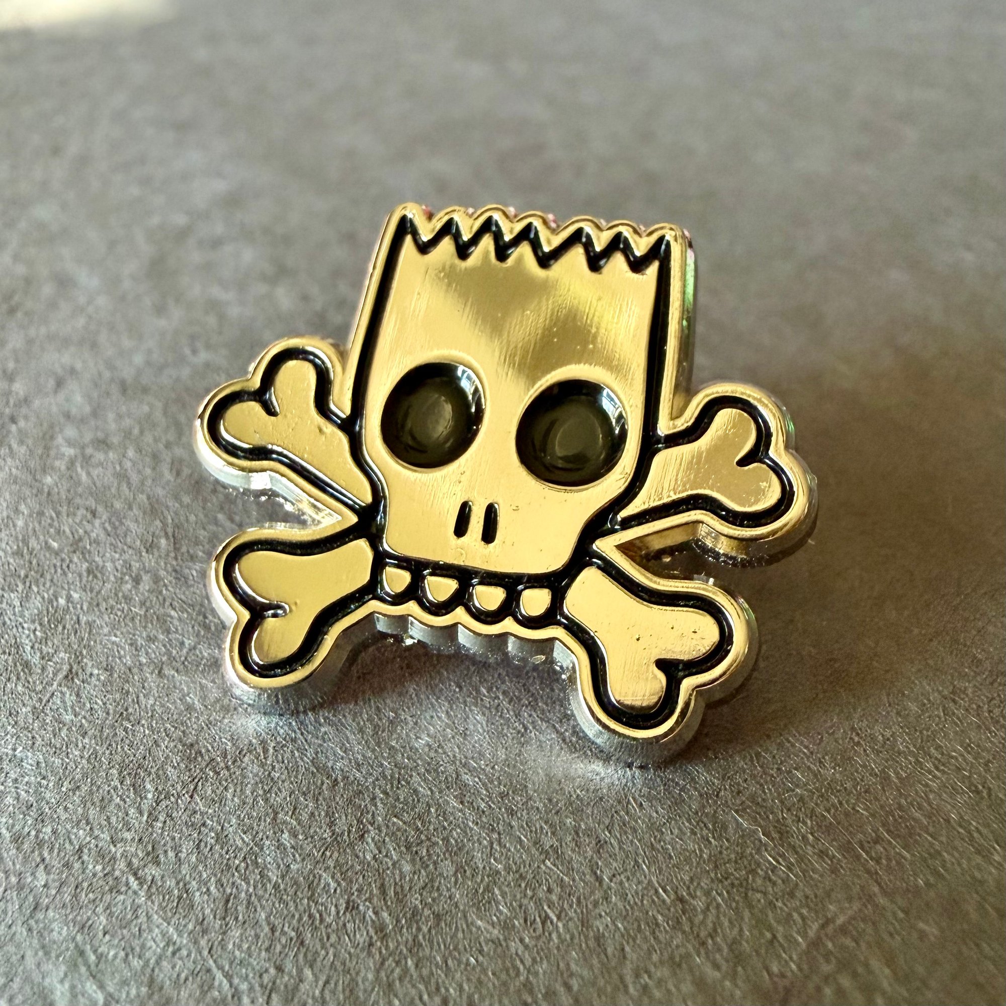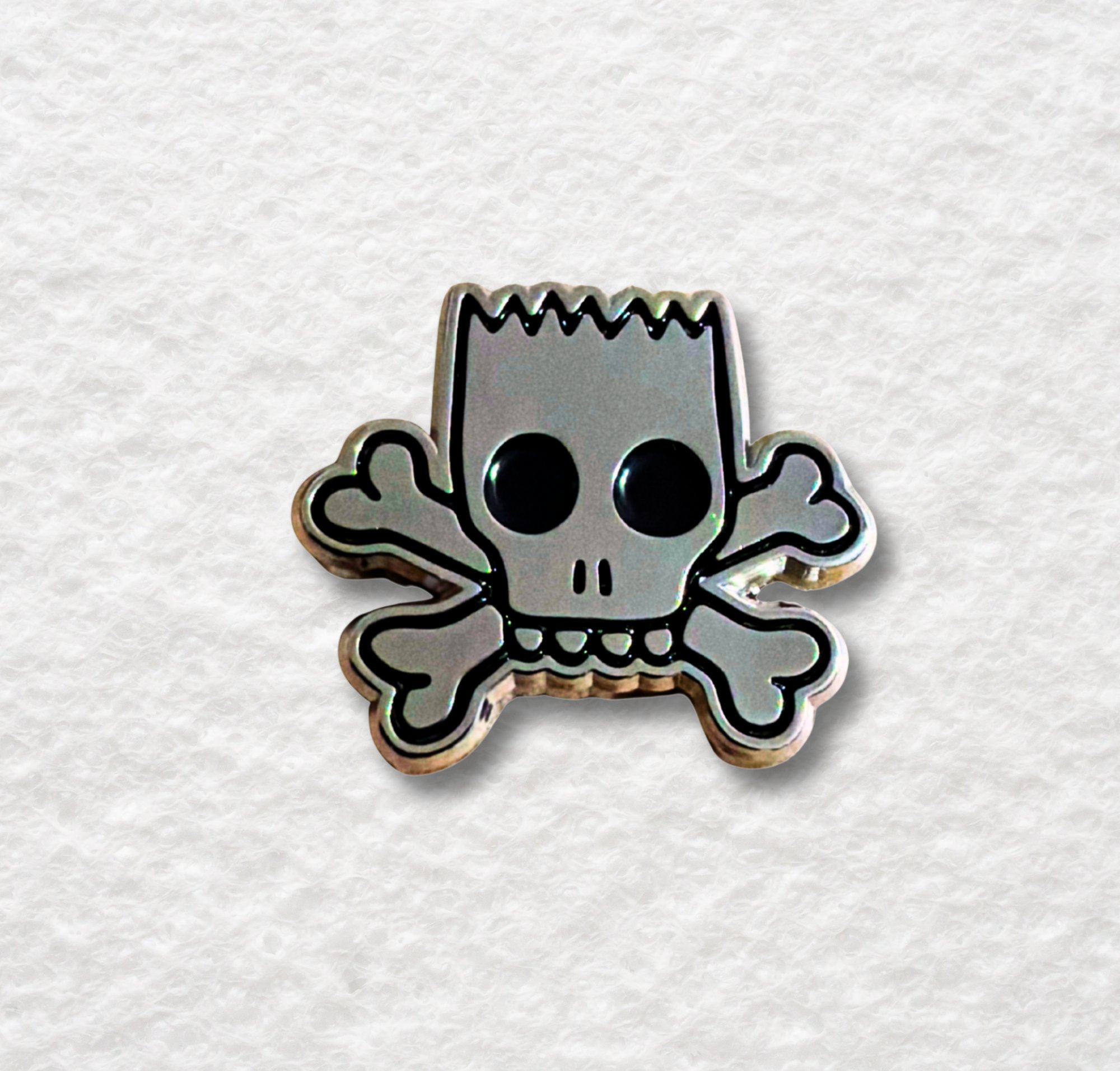 This skull and crossbones enamel pin is inspired by the vintage Bart Simpson skateboard graphic, a nostalgic throwback for fans of 90s cartoons and skate culture.