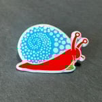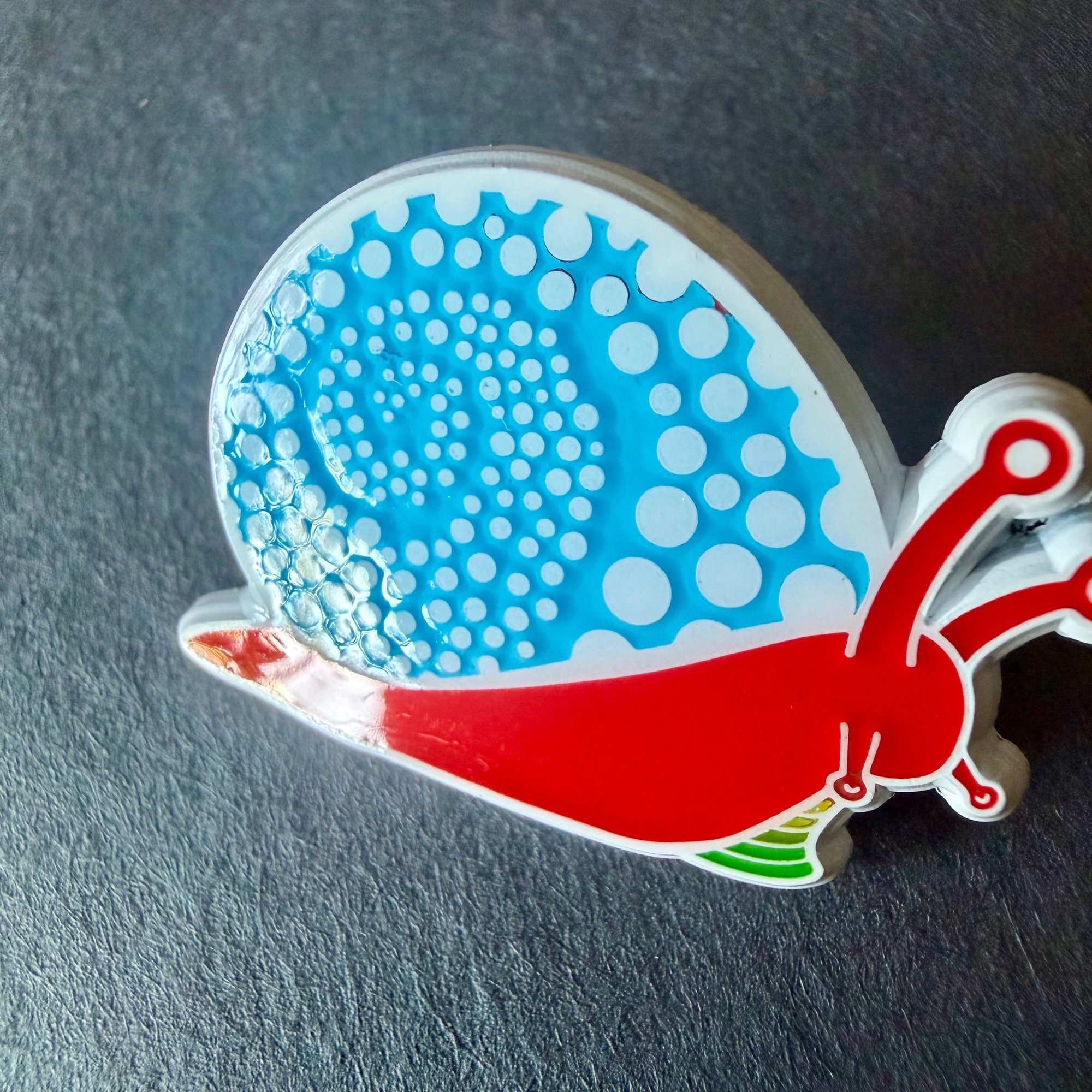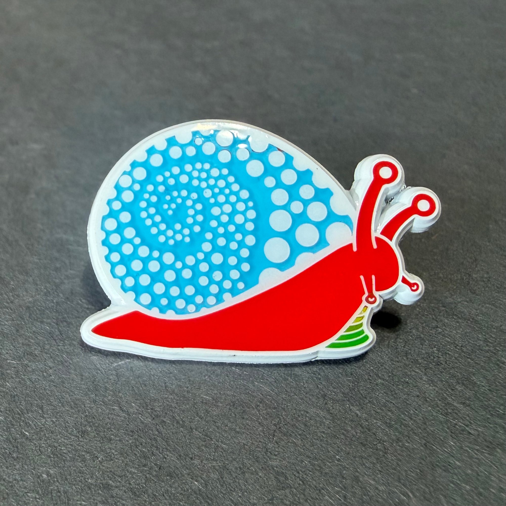 Funky snail with swirling shell enamel pin. Made in soft enamel with a thin layer of epoxy. Enamel pops across the dyed white plating. Two pinbacks on each.