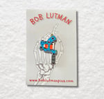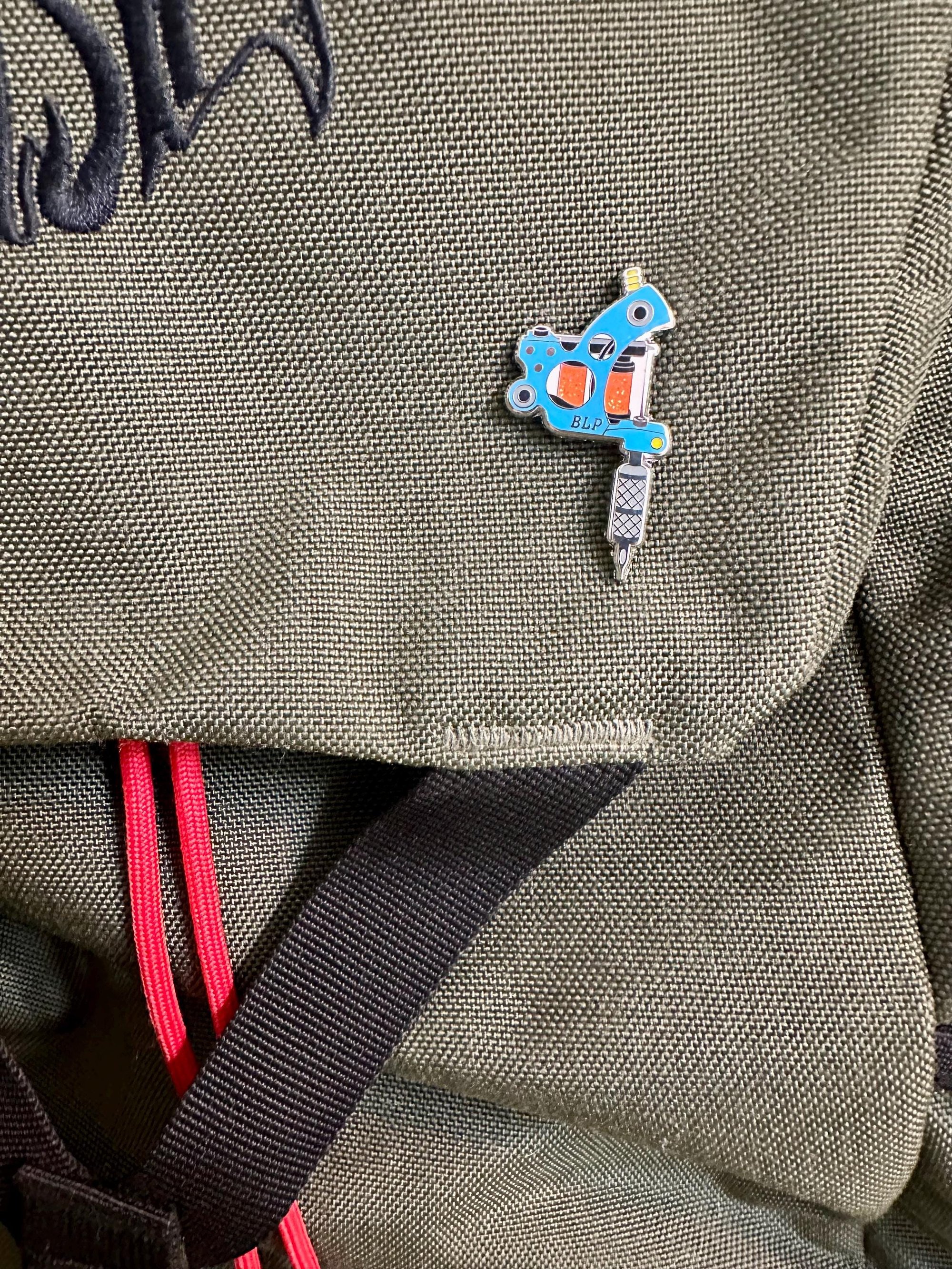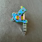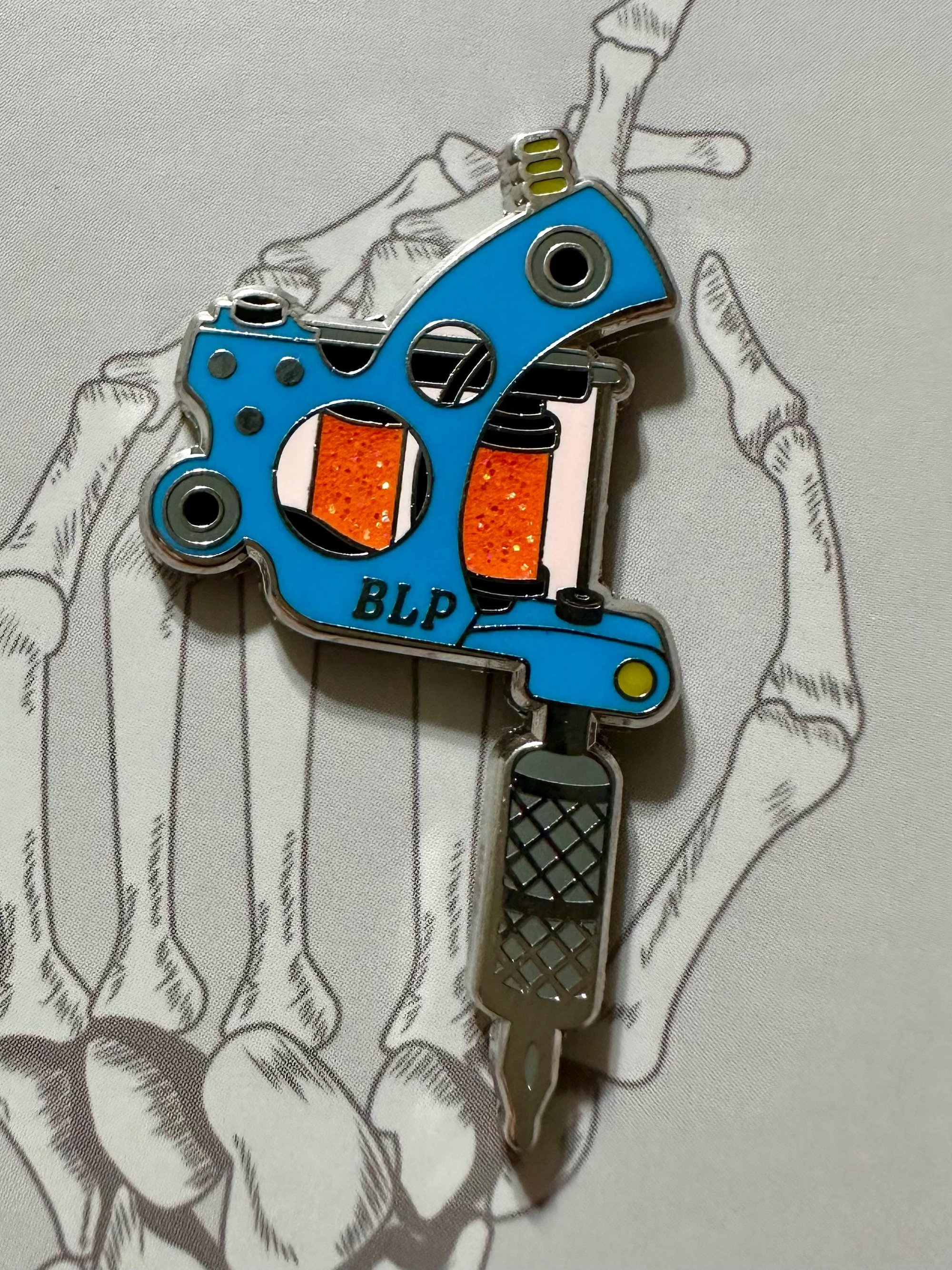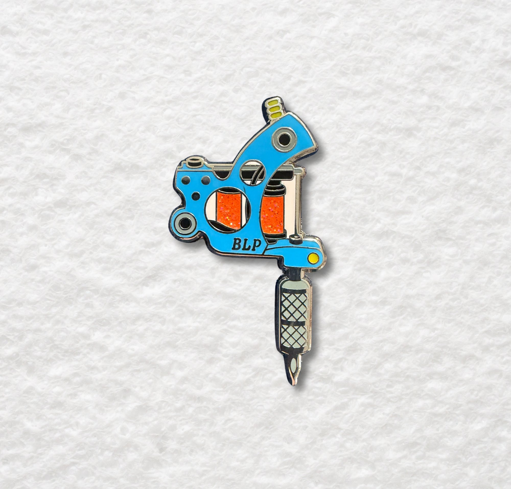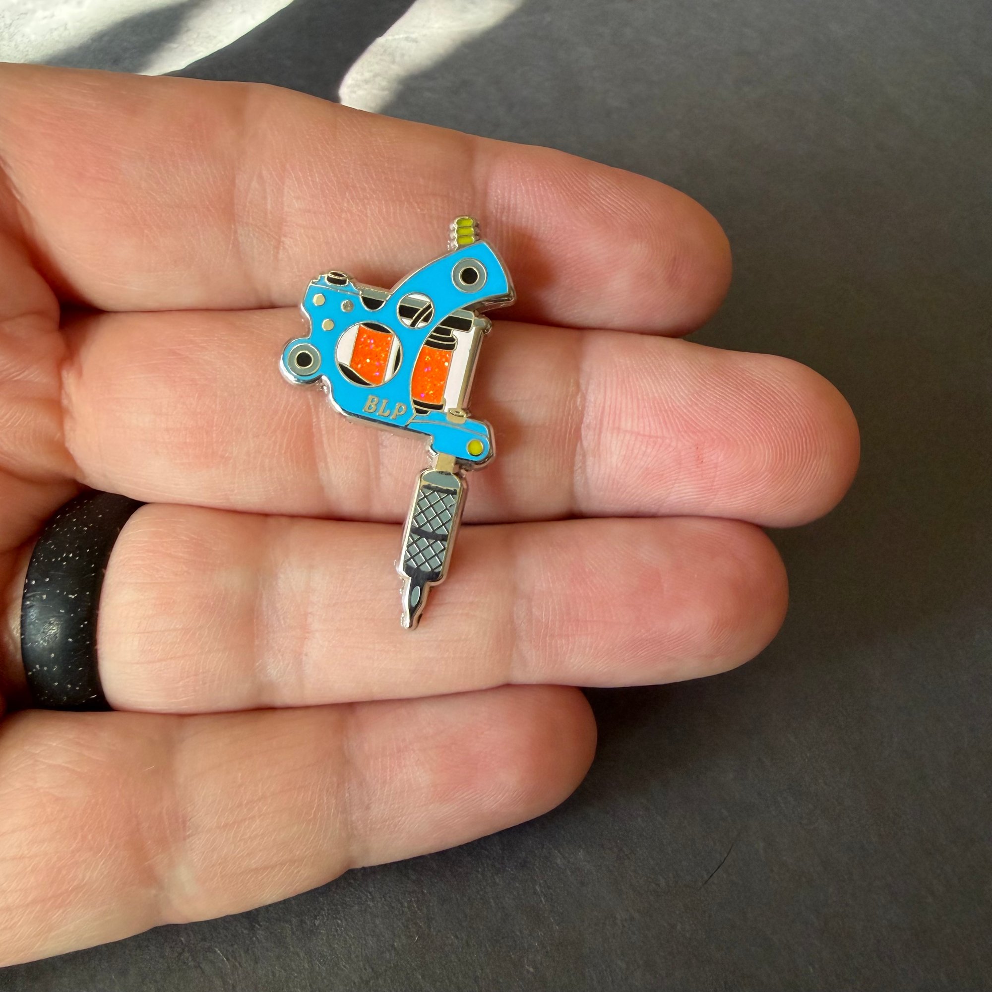 This tattoo machine enamel pin is painted blue with orange glitter accents, a bold little tribute to traditional tattoo culture and shop life.