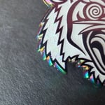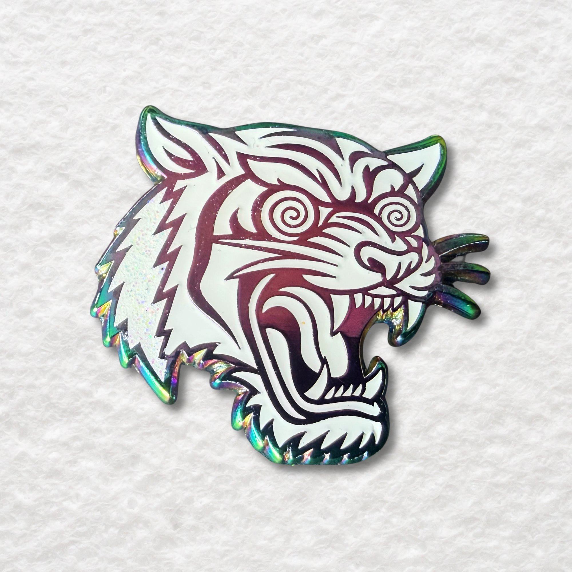 Tigers in a Trance enamel pins with three striking color options. The white tiger is printed on rainbow metal plating and has glitter in the thirteen point dead bolt. The blue and gold have radiant glitter throughout the face of the tiger.