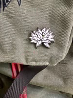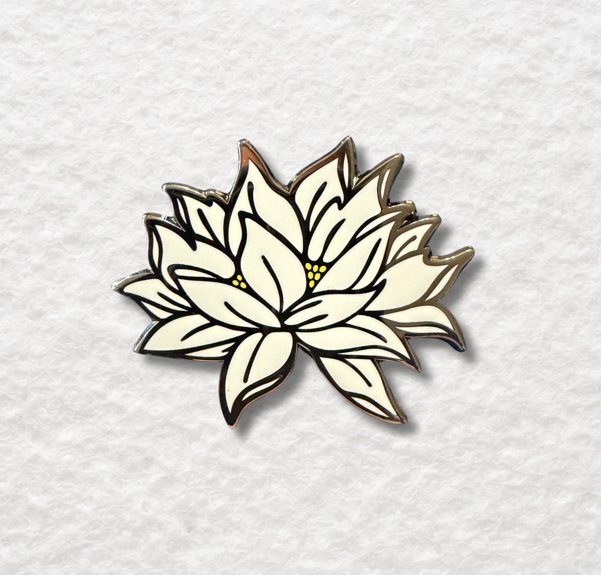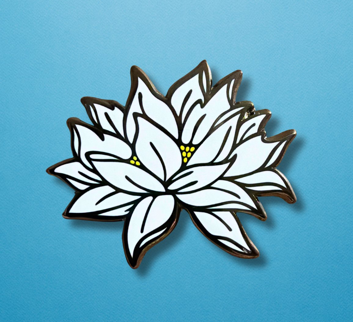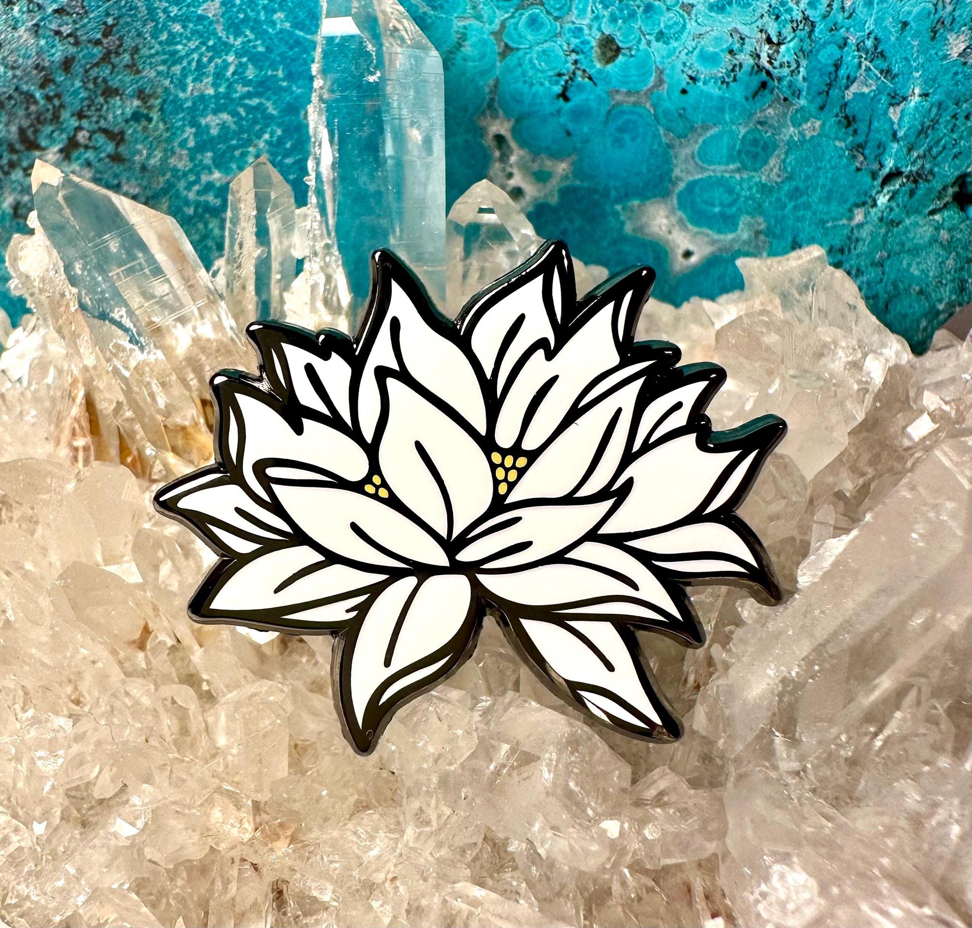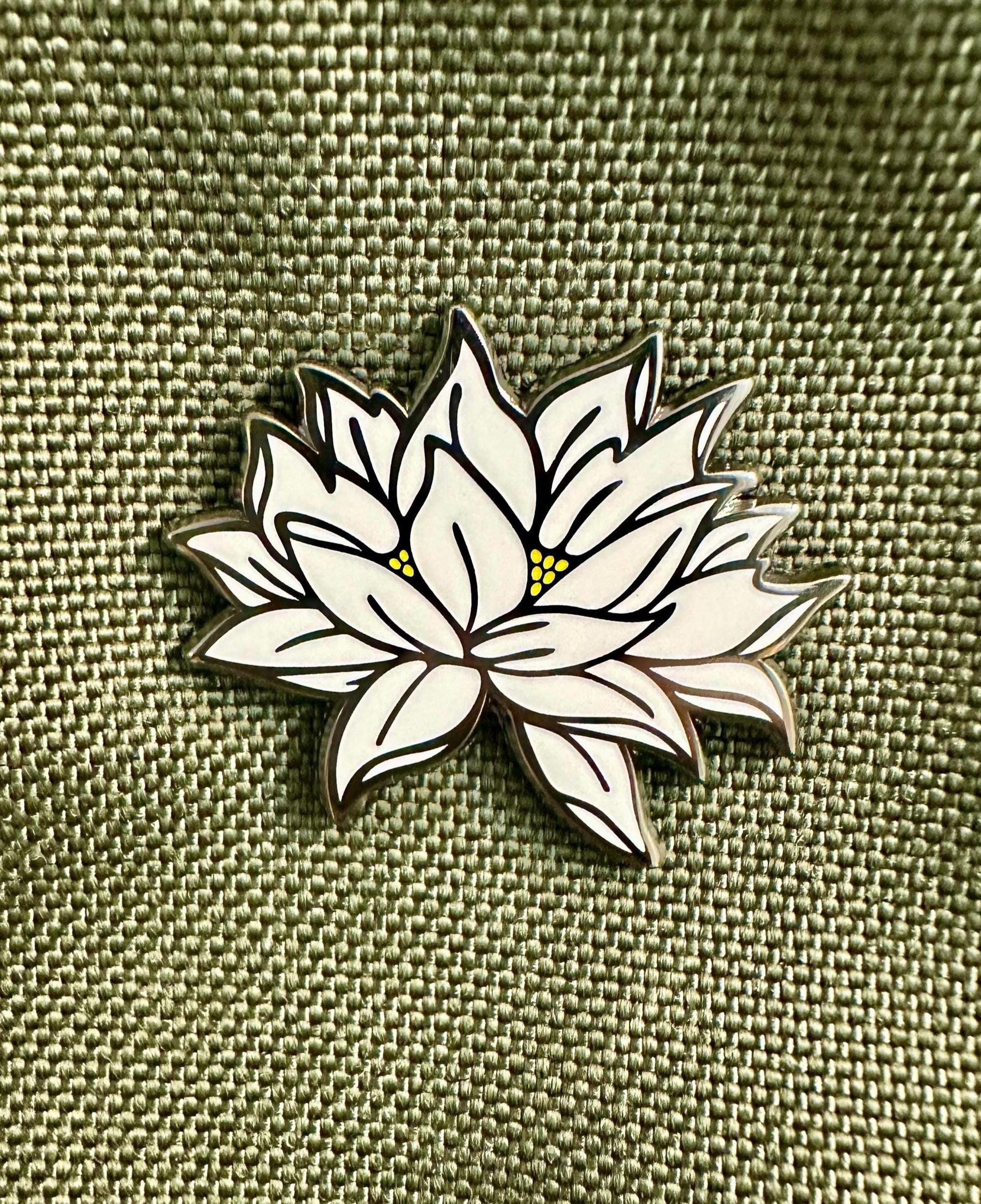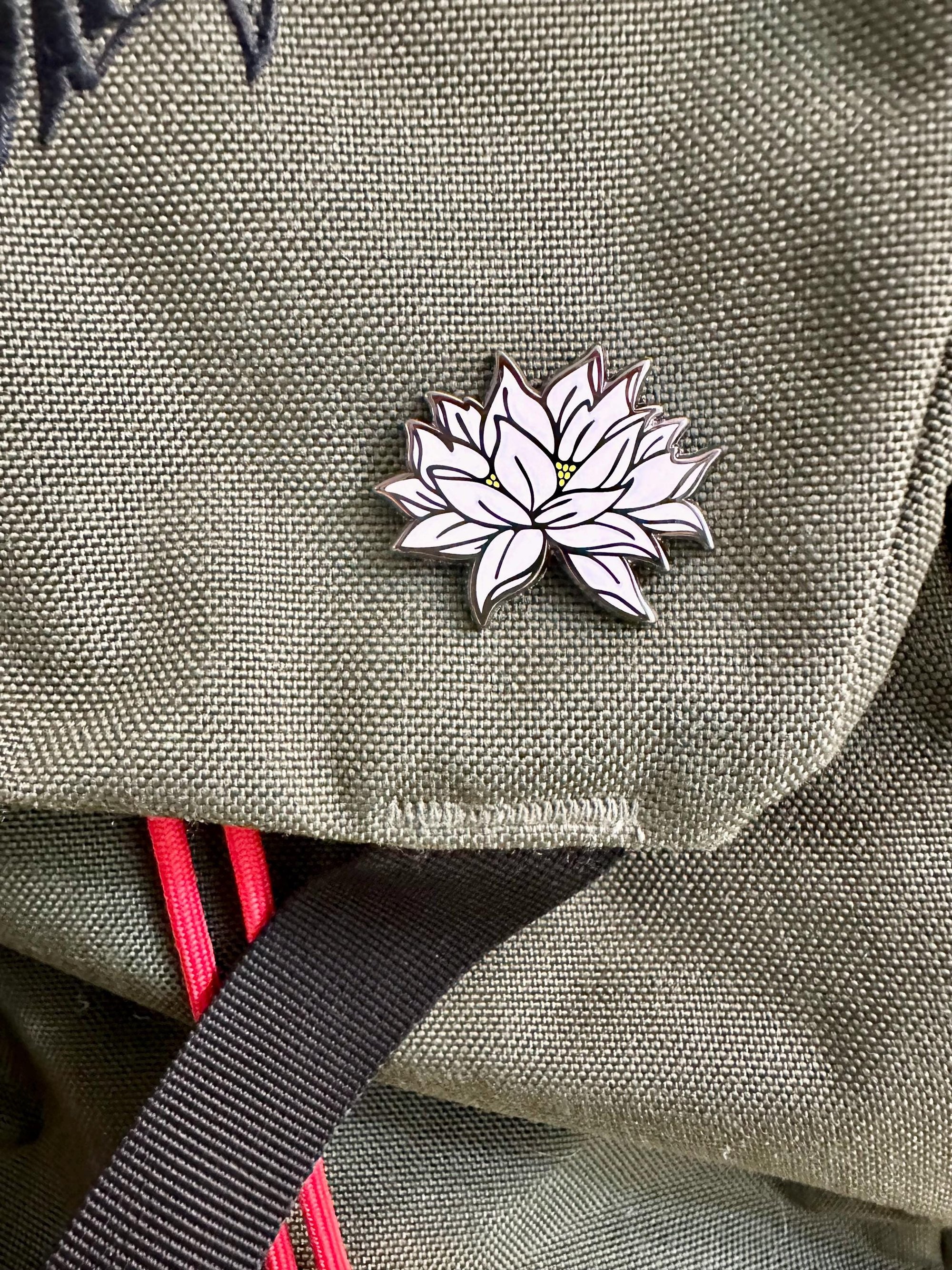 This white lotus enamel pin showcases a simple, elegant floral design, perfect for peaceful aesthetics, yoga outfits, or minimalist nature lovers.